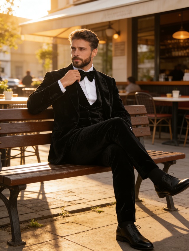 タキシード ブラック ビロード ネックタイ ジャケット、ベスト、パンツの3点セット 結婚式 新郎衣装