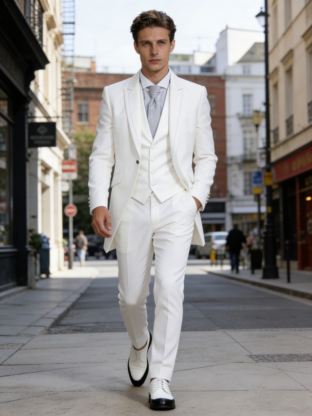 タキシード オフホワイト ネックタイ 結婚式 新郎衣装 ジャケット、ベスト、パンツの3点セット