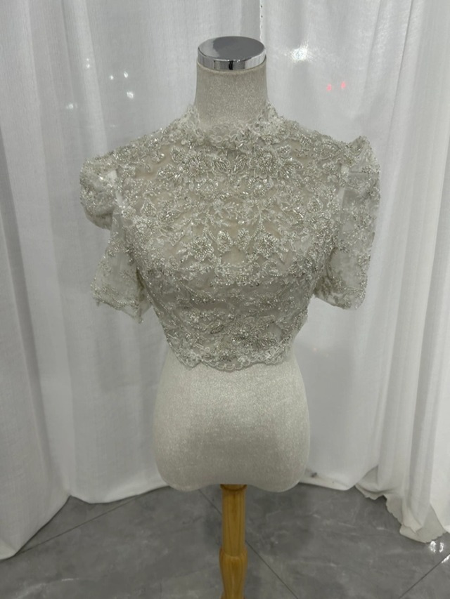 ボレロ ハイネック くるみボタン 半袖 インポートビジューレース 韓国風 豪奢 花嫁/ウェディングドレス