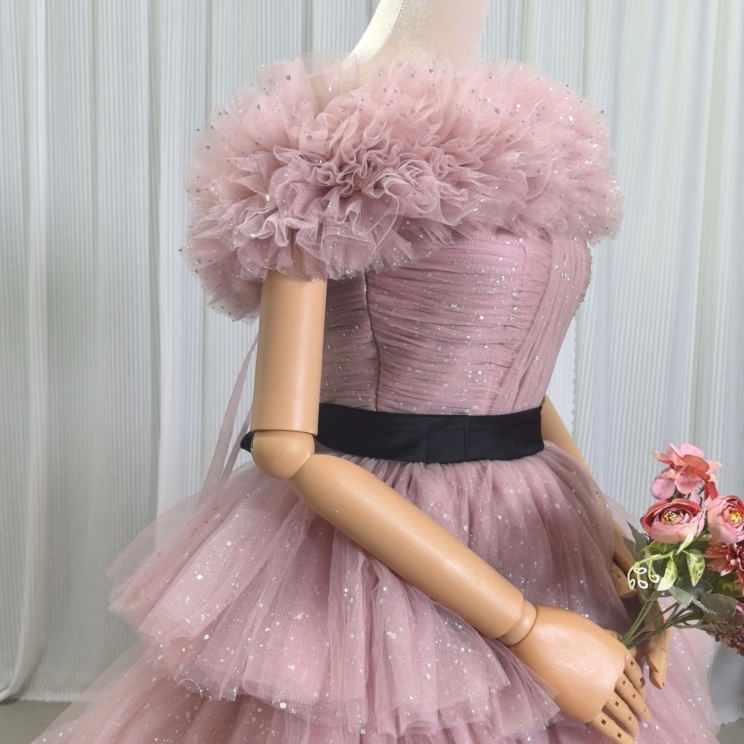 カラードレス 取り外しオフショルダー ピンク キラキラグリッターチュール 結婚式 ティアードのドレス 花嫁