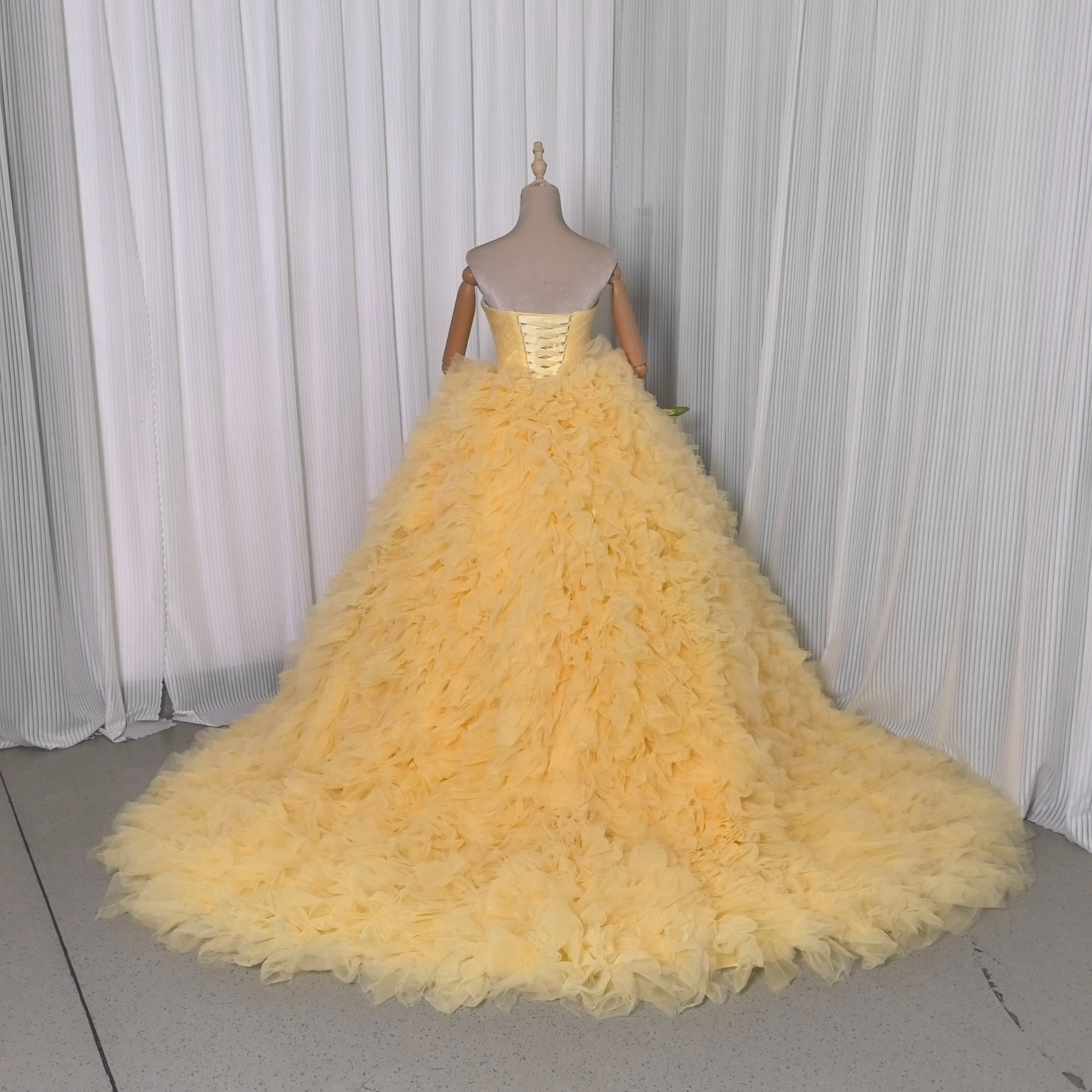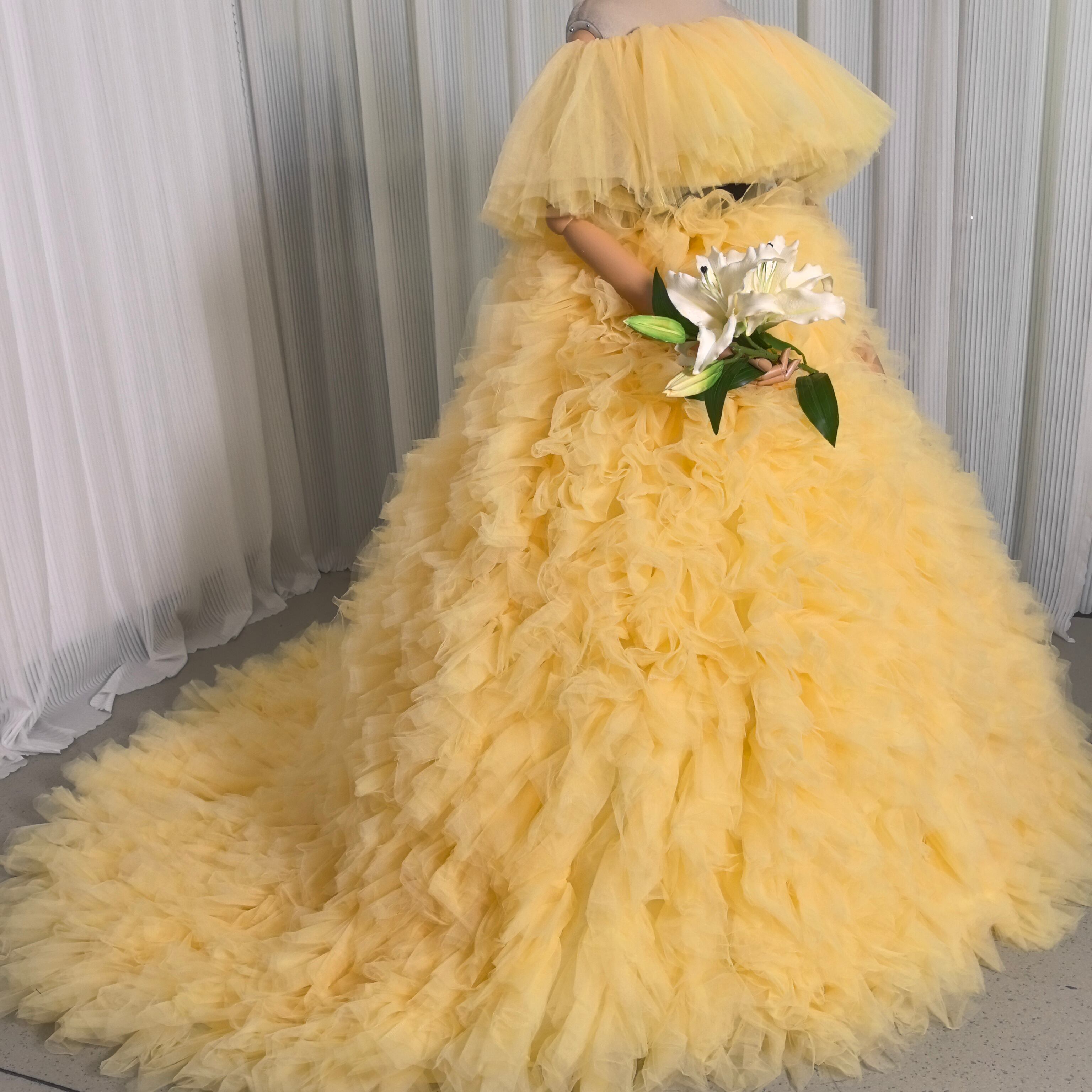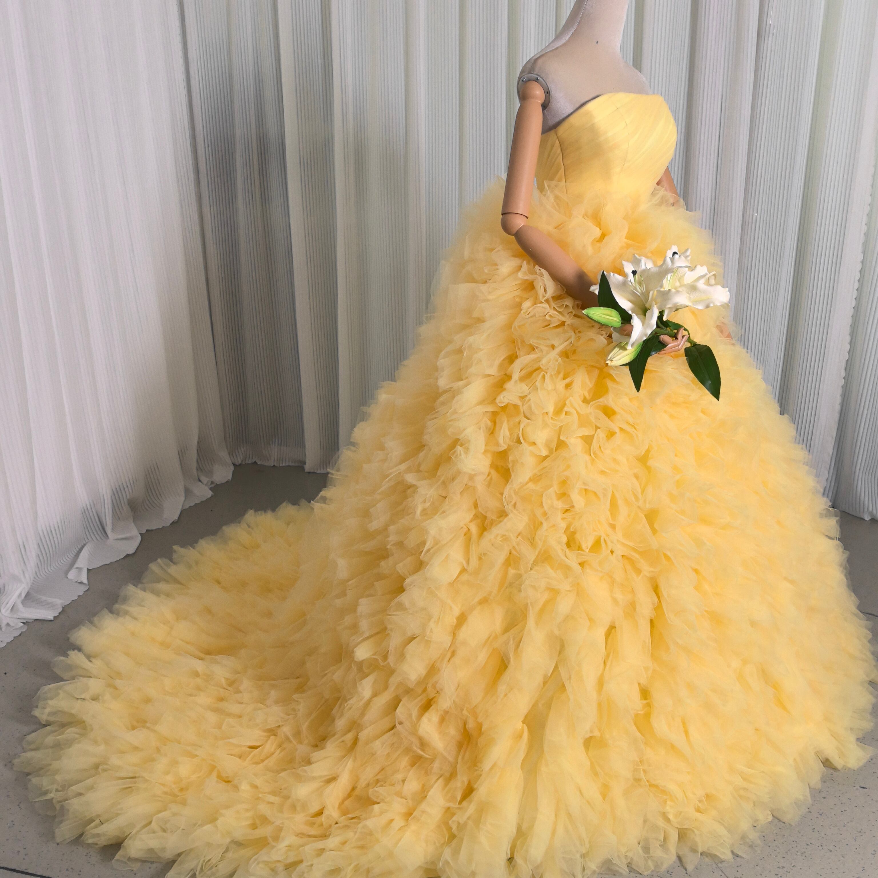 カラードレス パステルイエロー オフショルダー もこもこドレス チュールドレス 抜群のおしゃれ見え 目立つ