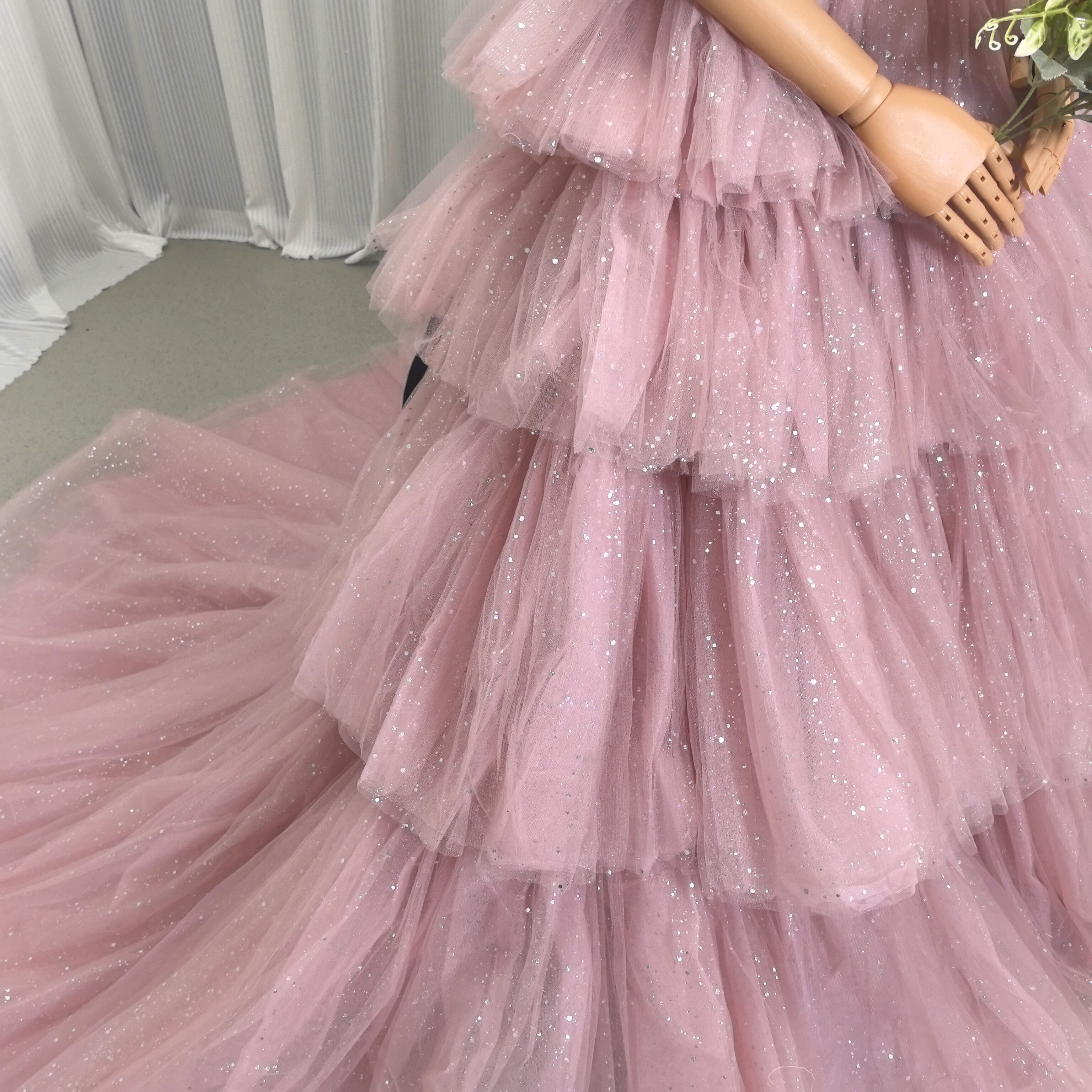 カラードレス ベアトップ ベルト ピンク キラキラグリッターチュール 結婚式 ティアードのドレス 花嫁