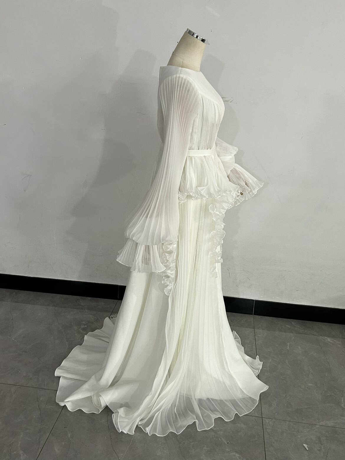 高品質! ウェディングドレス プリーツスカート ロングスリーブ ブライダル ファスナー 華やかなトレーン