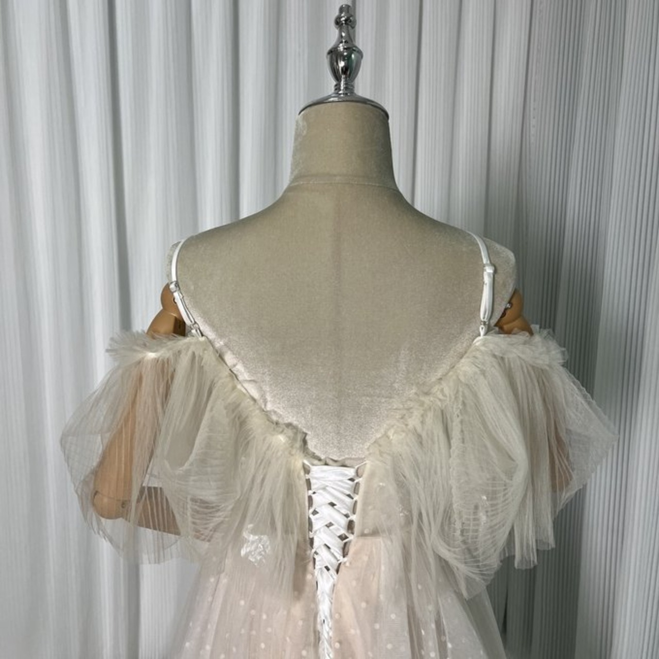 キャミソール オフショルダー 編み上げ 枝花刺繍 チュールスカート オフホワイト パーティードレス 前撮り結婚式 可愛い