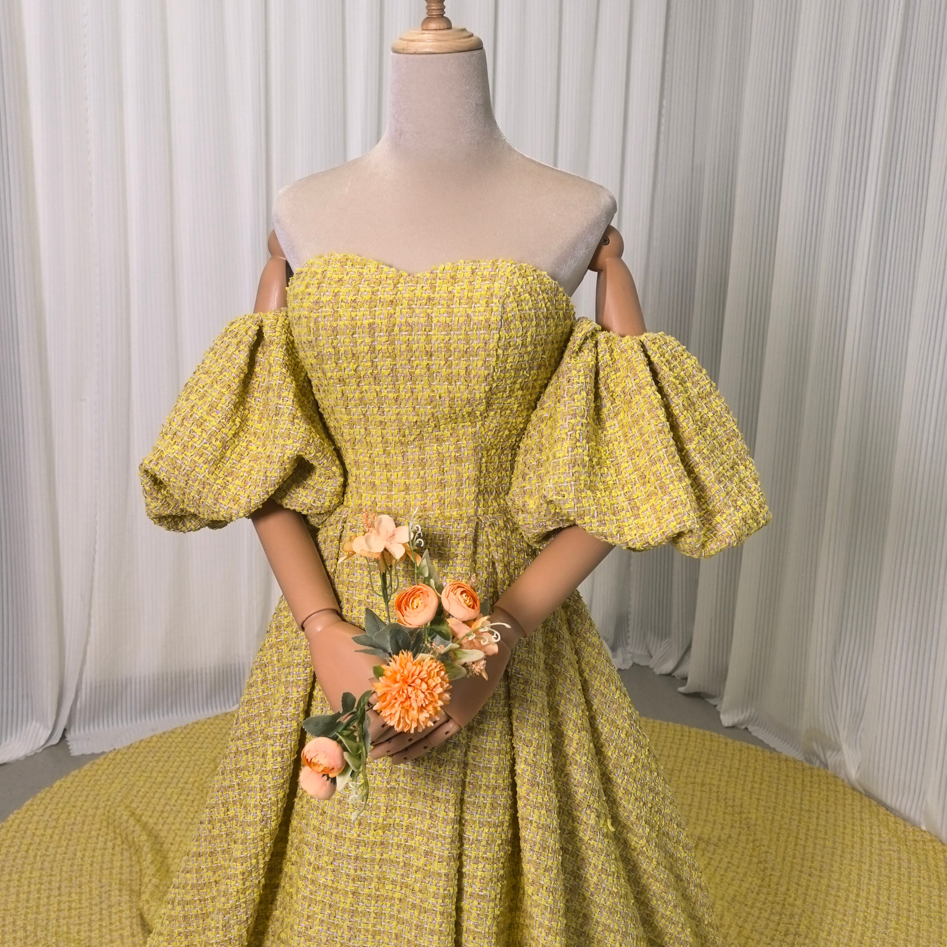 パーティードレス パフスリーブ イエロー ツイードドレス 編み上げ 前撮り 二次会