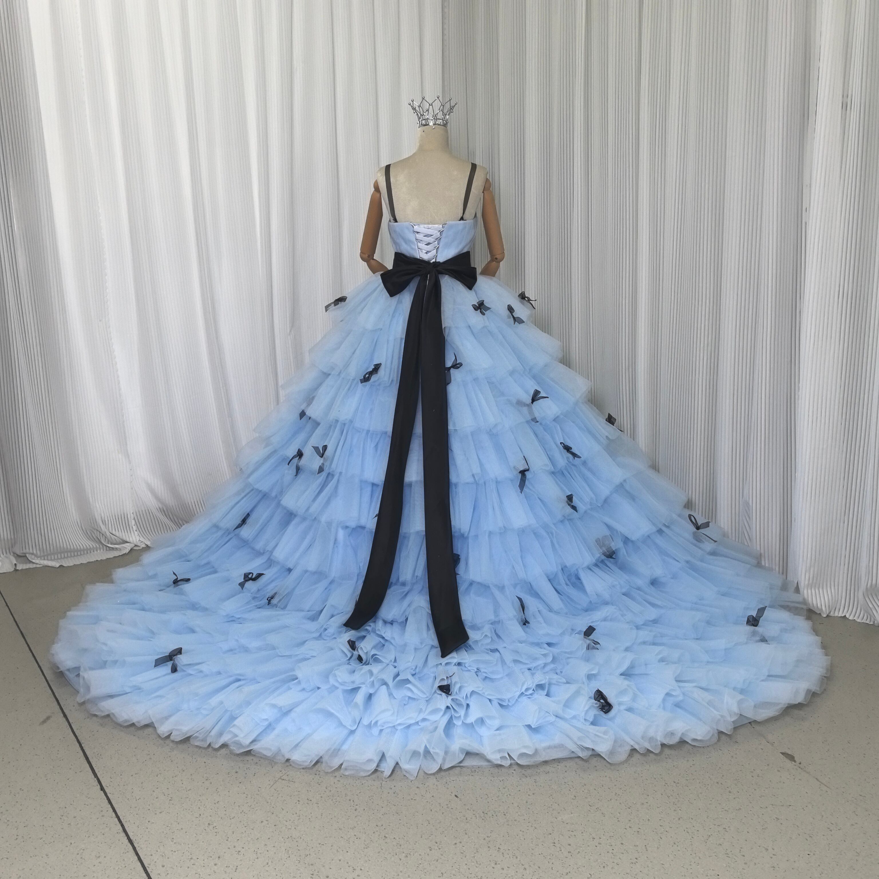 カラードレス ブルー ティアードのドレス リボン キャミソー プリンセスライン 結婚式 花嫁 サッシュベルト