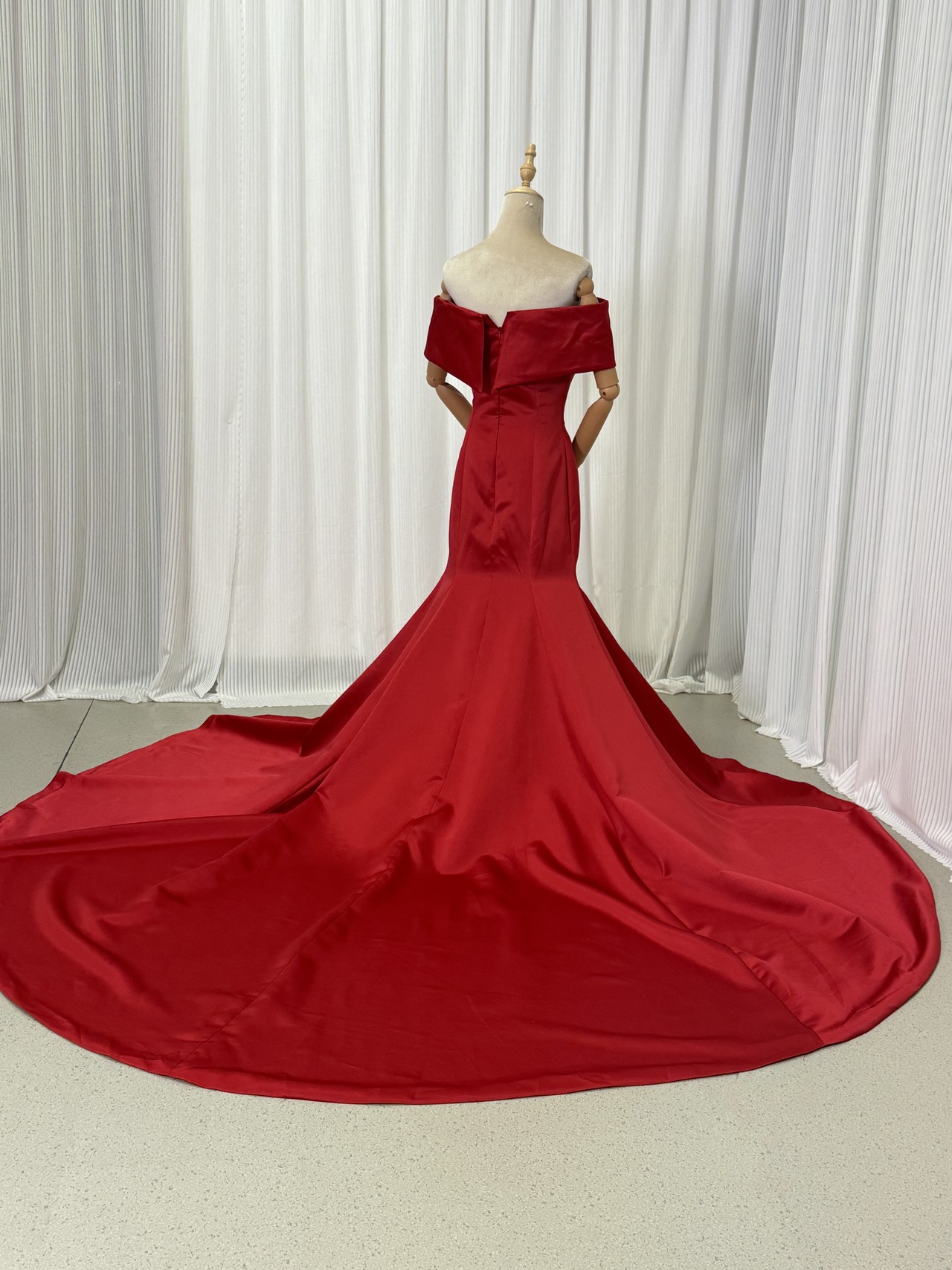 パーティードレス ボルドー色 オフショルダー マーメイドライン 光沢サテン 結婚式 アンティークなドレス