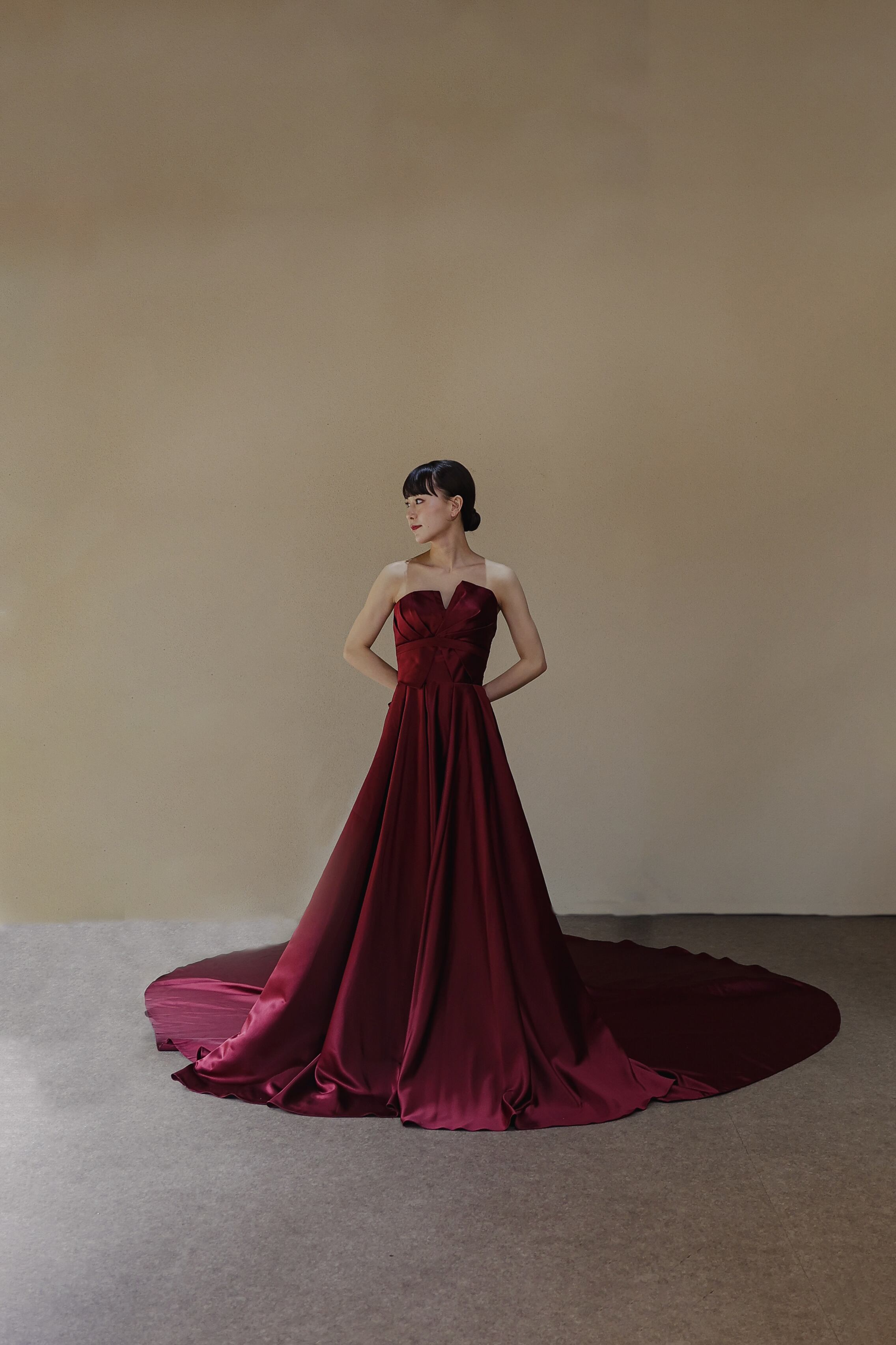 カラードレス ベアトップ ボルドー色 光沢サテン 前撮り アンティークなドレス 花嫁 エレガント