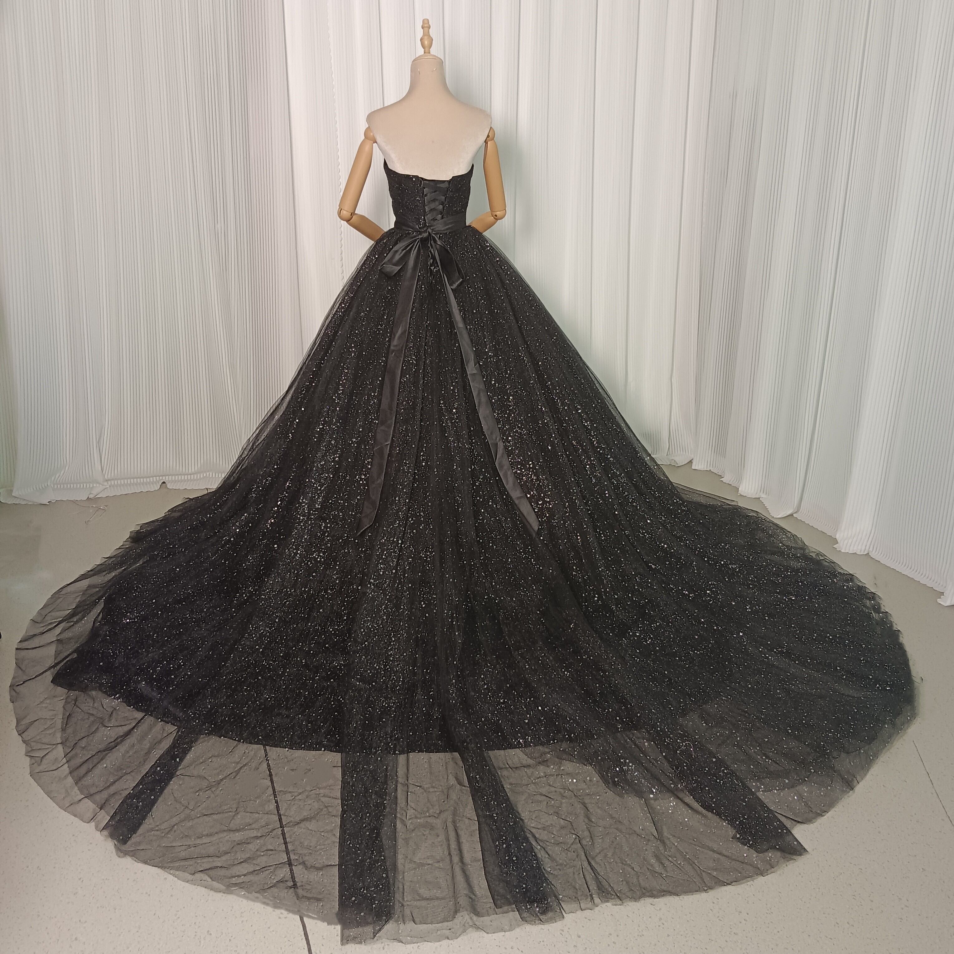カラードレス ブラック キラキラグリッターチュール ベアトップ ソフトチュール ロングトレーン 前撮り