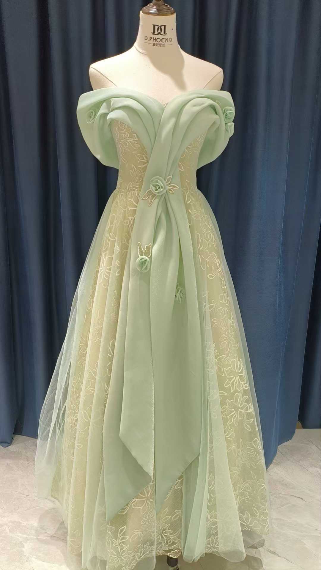 カラードレス ピスタチオグリーン オフショルダー ロング ピアノ 贅沢な小花総レース パーティーワンピース