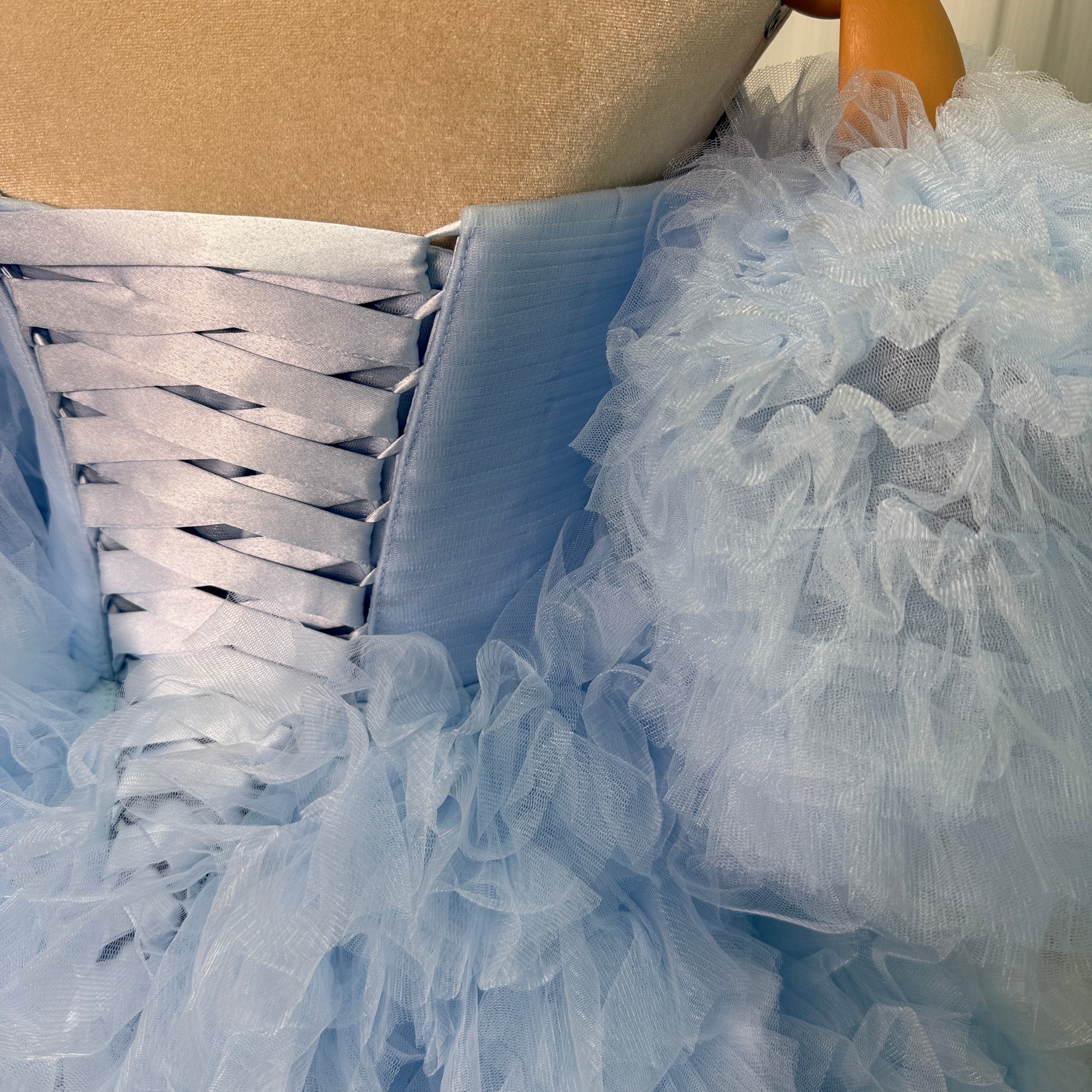 カラードレス ブルー パフスリーブ 編み上げ もこもこドレス ロング 結婚式 ふわふわ プリンセスライン