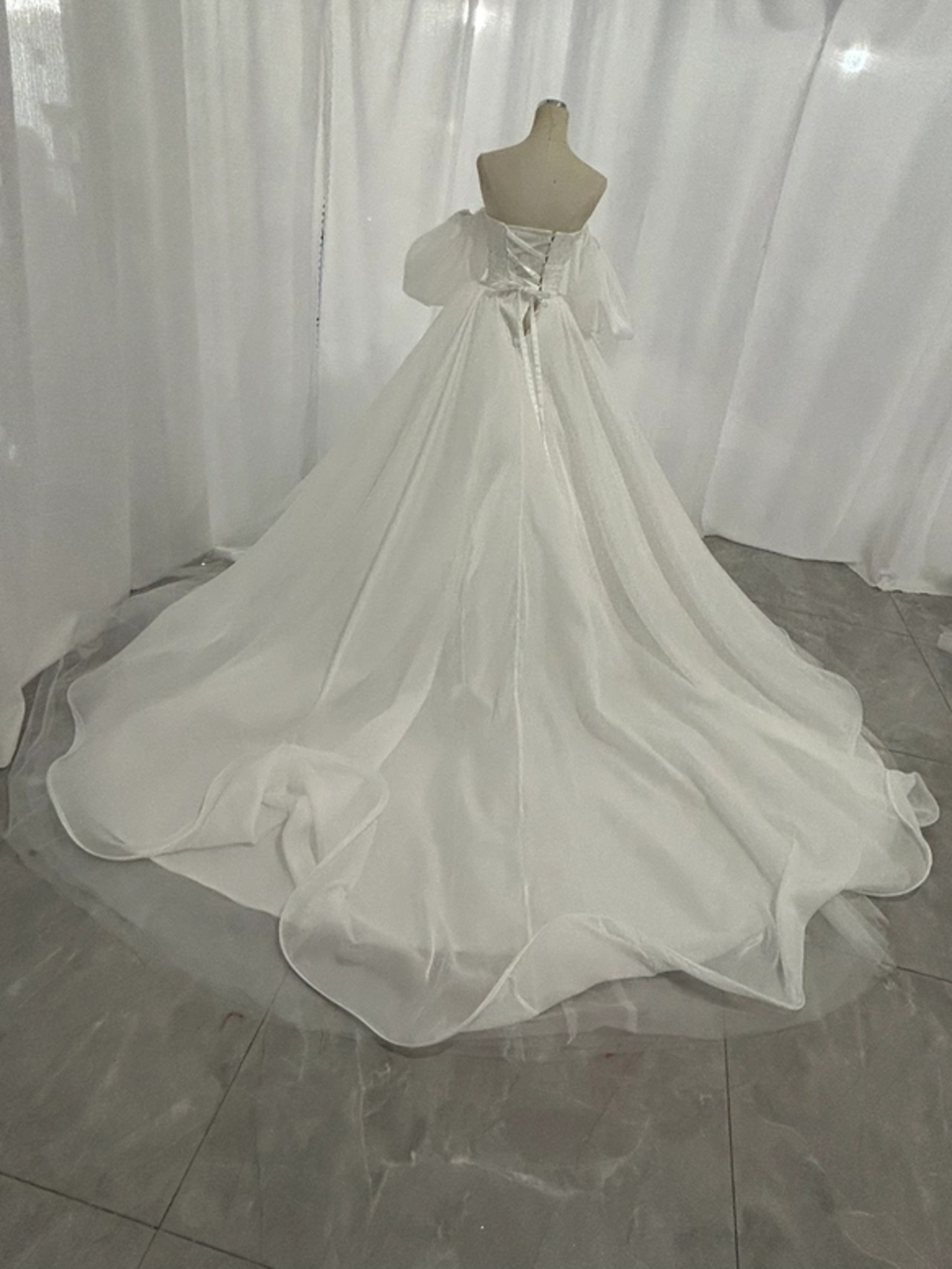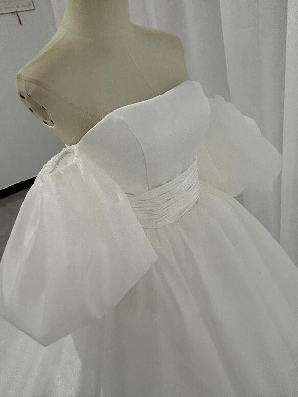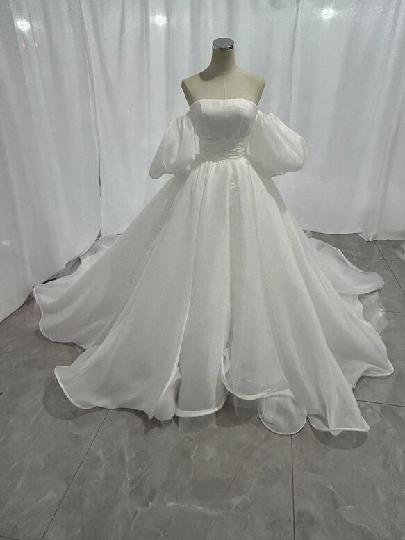 パーティードレス ベアトップ パフスリーブ 楊柳オーガンジー ロングトレーン クラシカル 披露宴