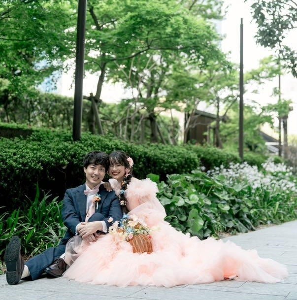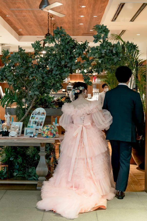 実例写真!カラードレス オフショルダー コーラルピンク ティアードチュ もこもこドレス プリンセスライン 結婚式 前撮り