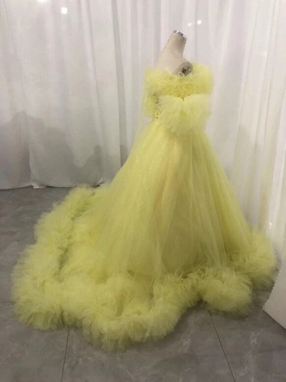 大好評中!カラードレス イエロー ベアトップ 取り外し袖 ラッフルフリル キラキラチュール 前撮り