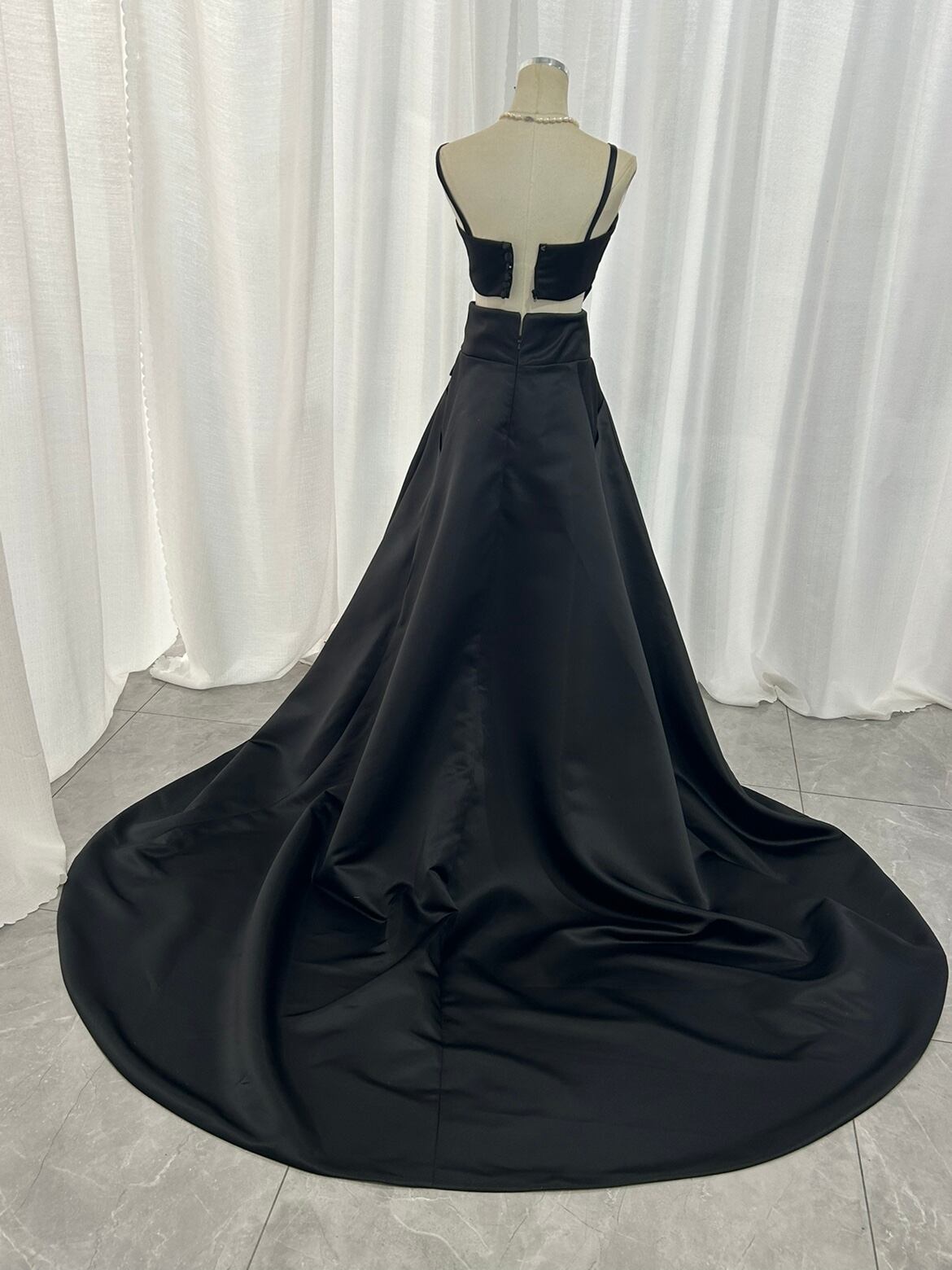 パーティードレス キャミソール ツーピース 編み上げ 光沢サテン 前撮り デザイン感 ブラック
