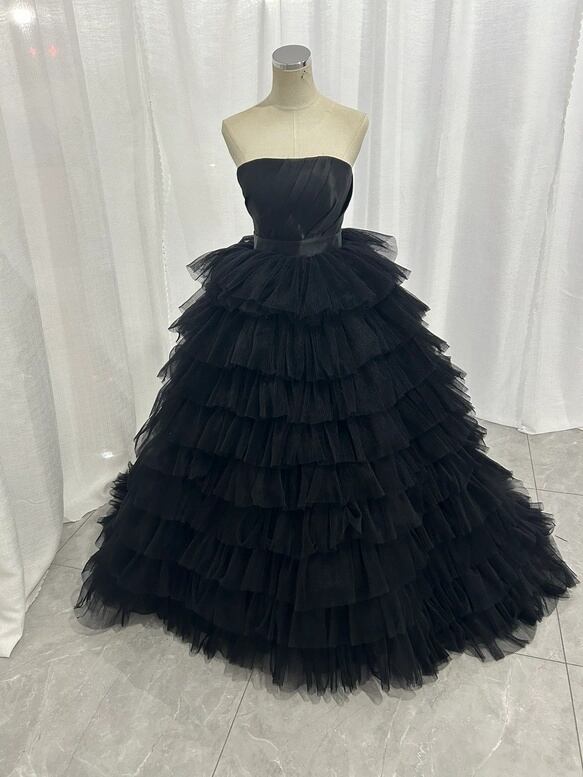 実例写真!カラードレス ブラック ベアトップ ティアードのドレス プリーツスカート オーバースカート 結婚式