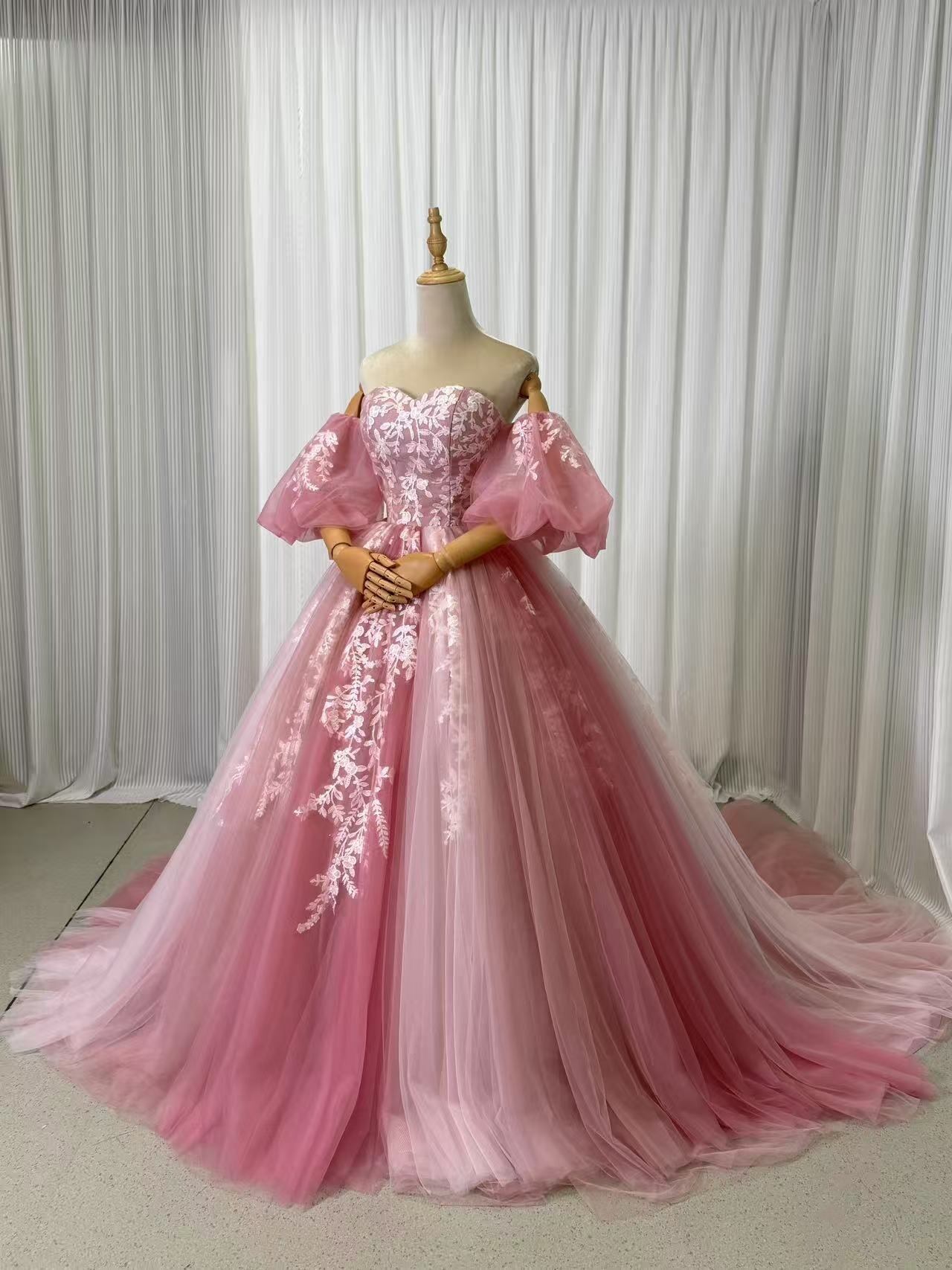 カラードレス 可愛い パフスリーブ リーフ刺繍 ピンク 抜群のおしゃれ見え 绮丽な 優しい 花嫁 編み上げ