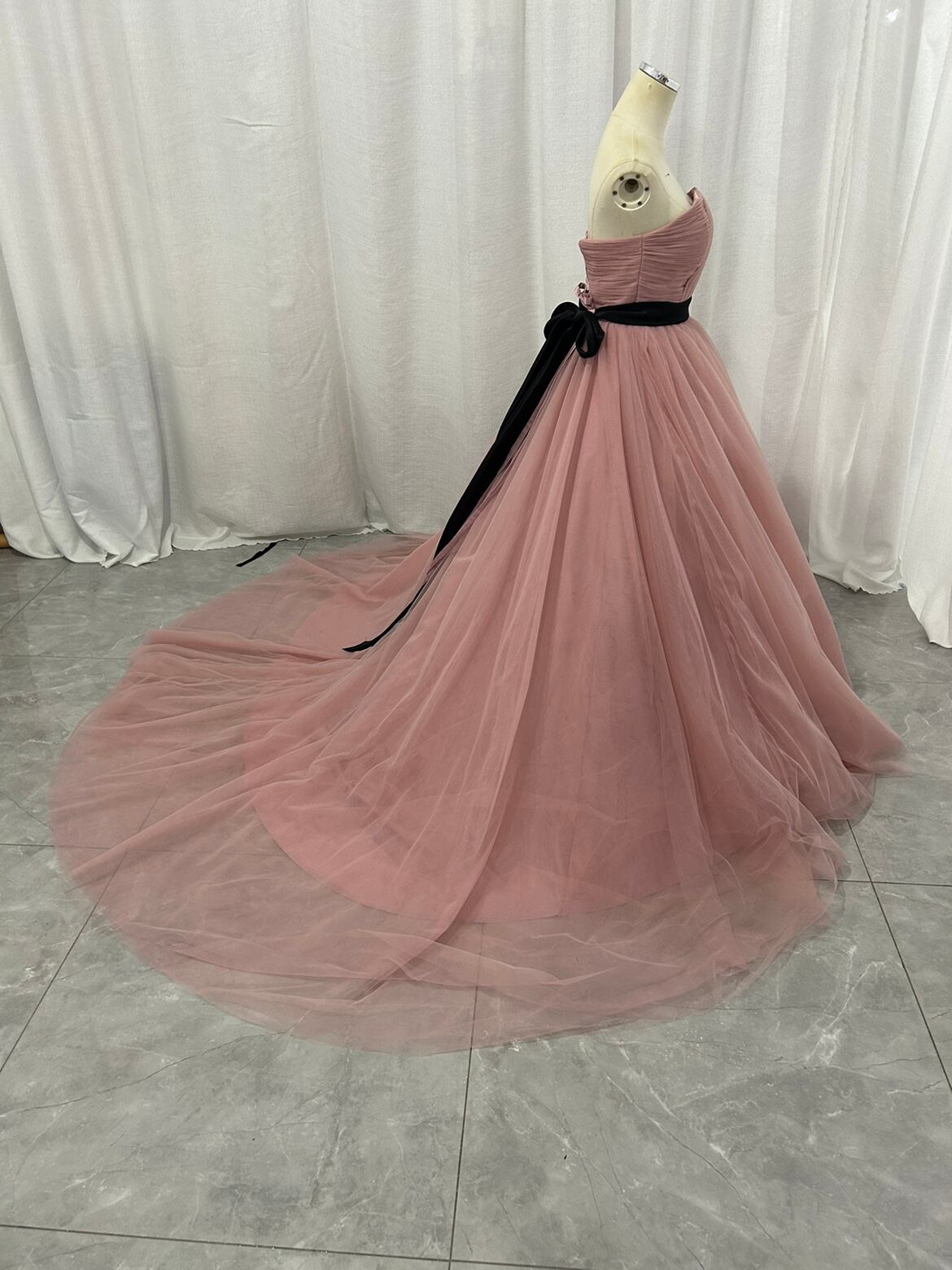 カラードレス ピンク オフショルダー サッシュベルト 柔らかく重ねたチュールスカート ビスチェドレス