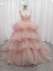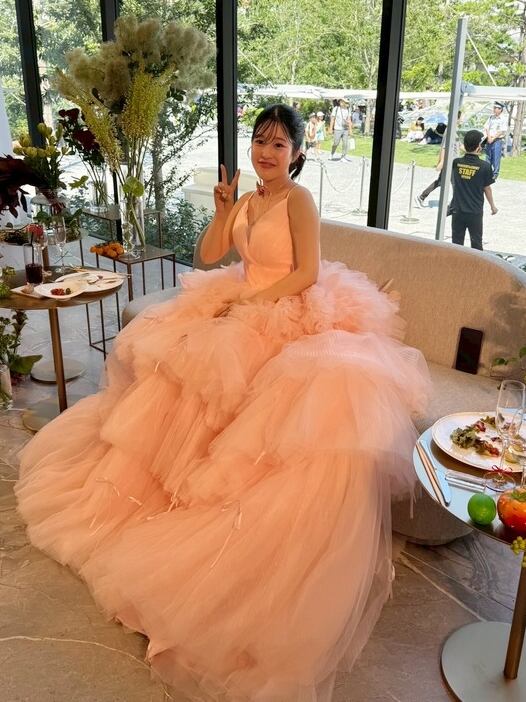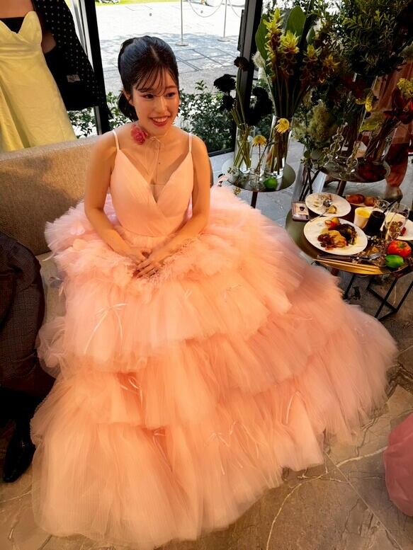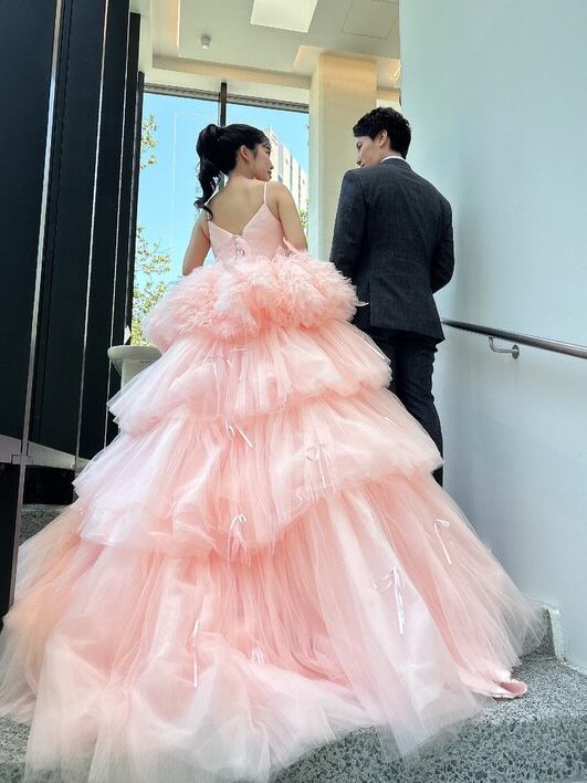 実例写真!カラードレス ピンク キャミソール ティアードのドレス プリンセスライン プリーツドレス 結婚式 可愛い