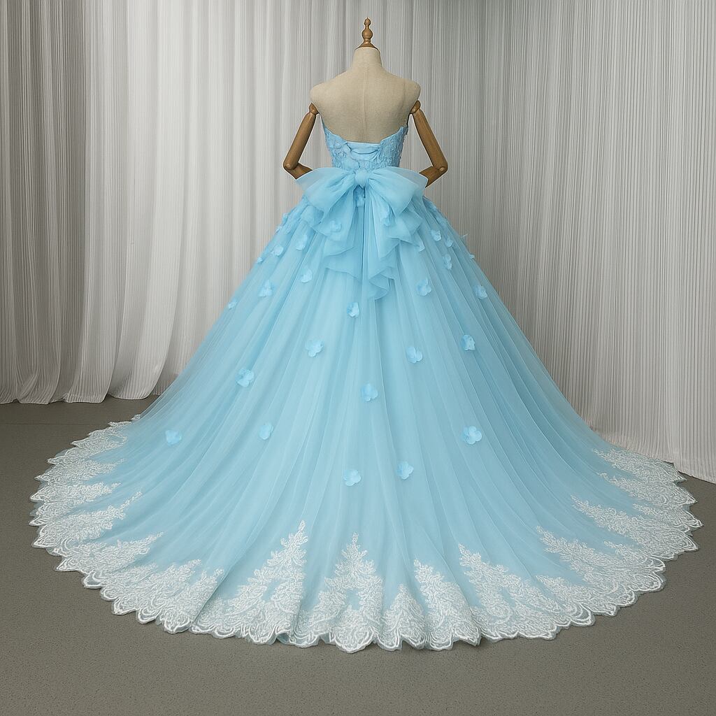 カラードレス ブルー 花モチーフ 立体ドレープ 裾に繊細レースをあしらった ベアトップ 編み上げ 花嫁