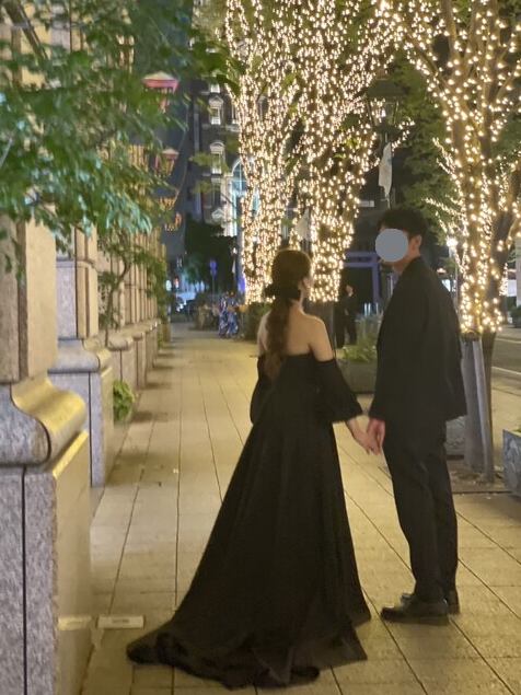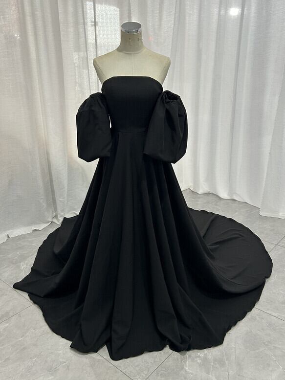 実例写真!パーティードレス ブラック パフスリーブ クレープ生地 マット生地 エレガント 前撮り