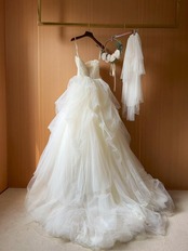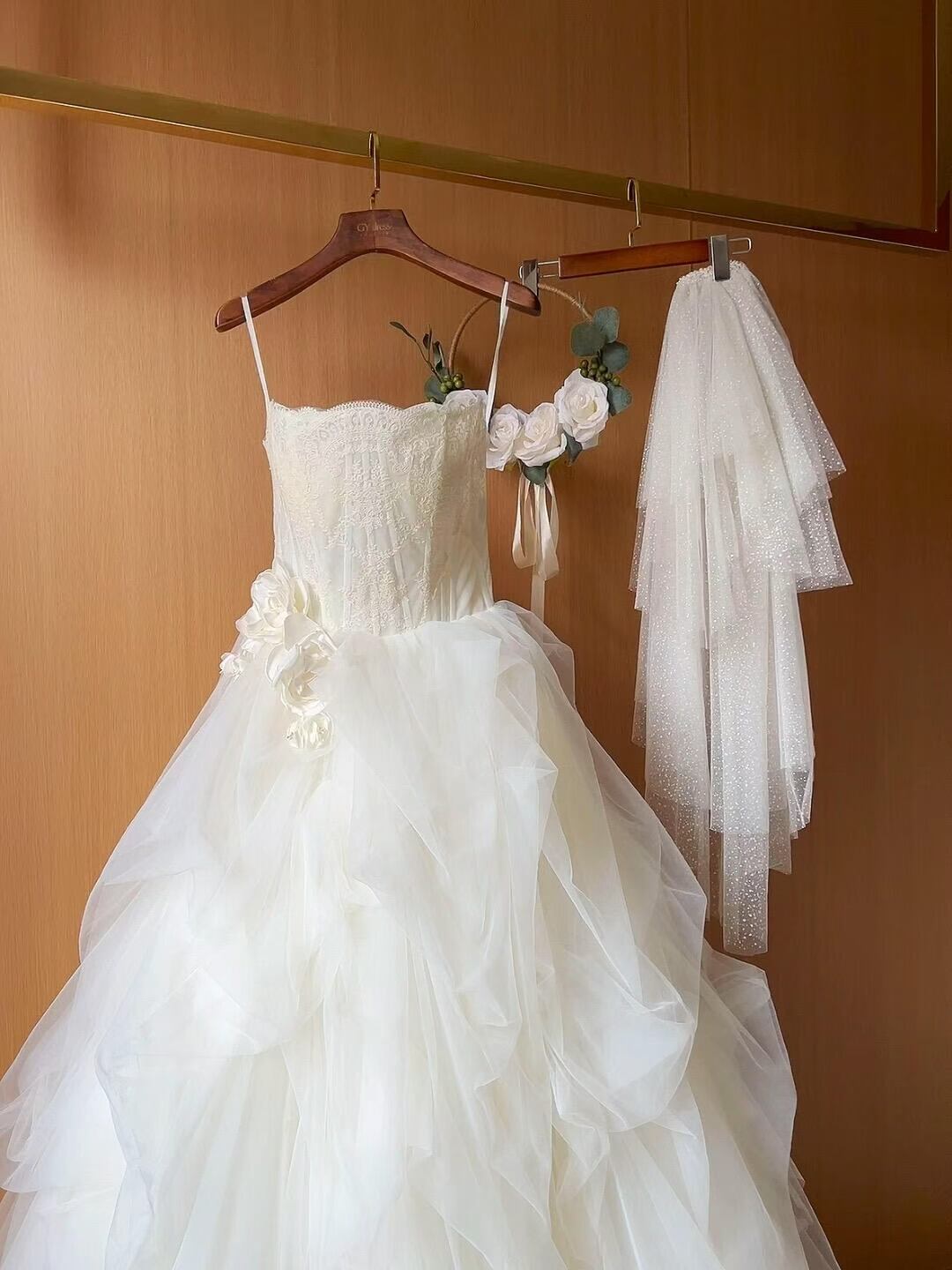 ウェディングドレス ラッフルフリル ベアトップ ショートベール プリンセスライン 結婚式/披露宴 花嫁