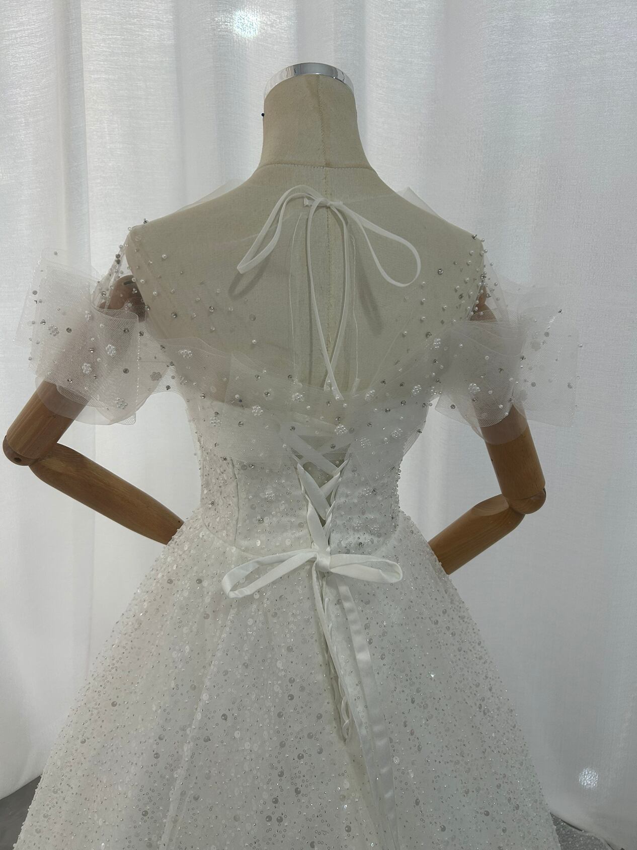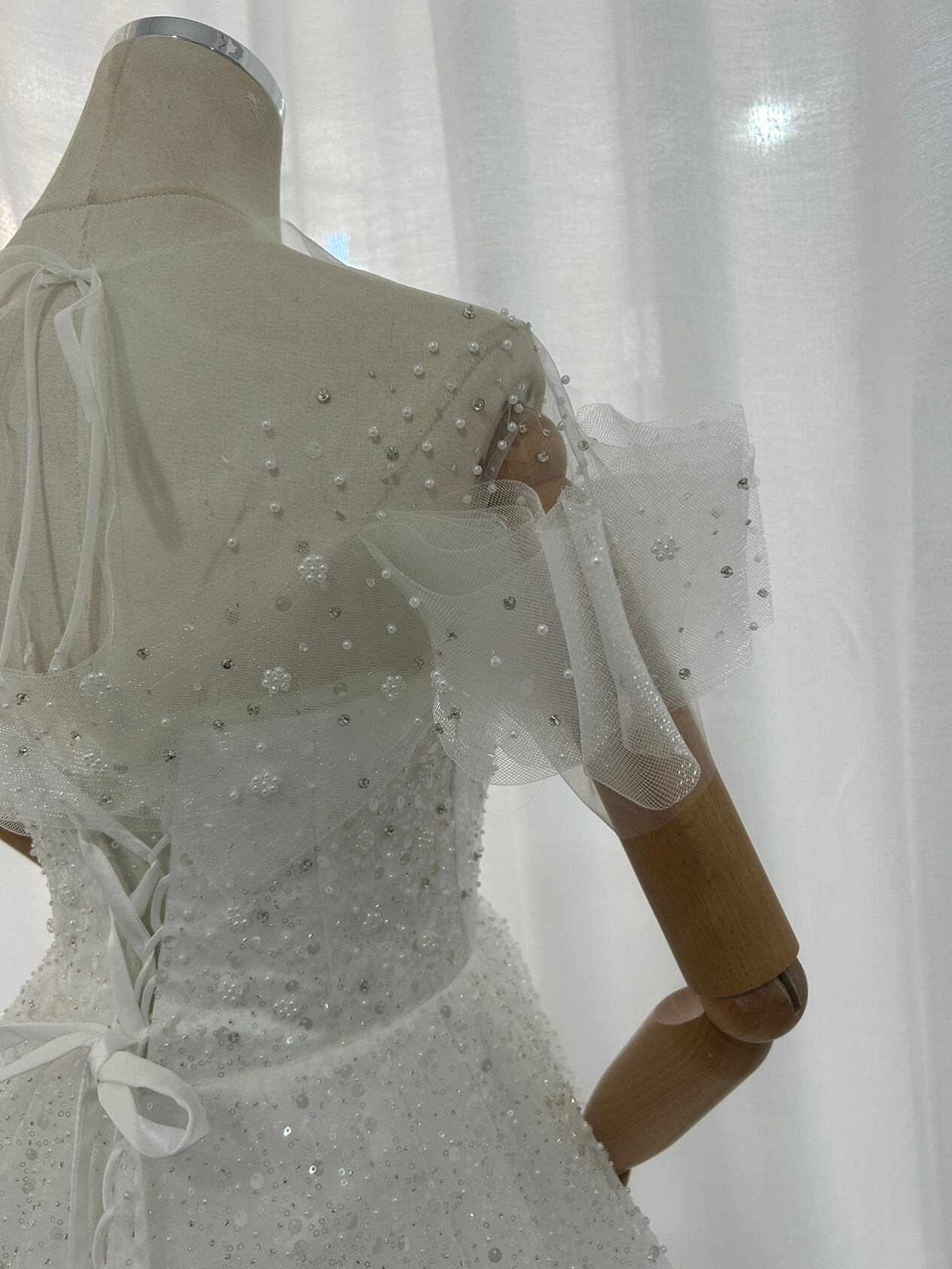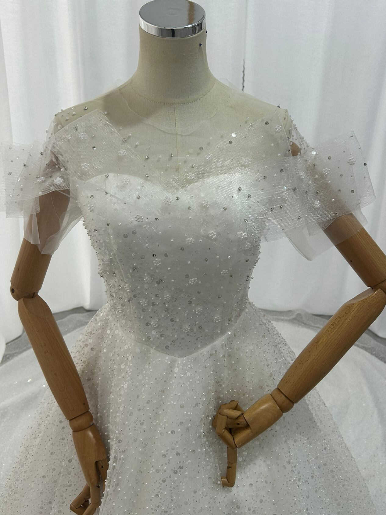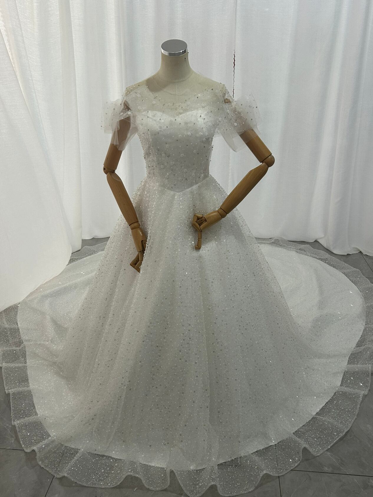 ウエディングドレス ホワイト パール ロングトレーン 短袖 ラウンドネック ソフトチュール 前撮り キラキラドレス
