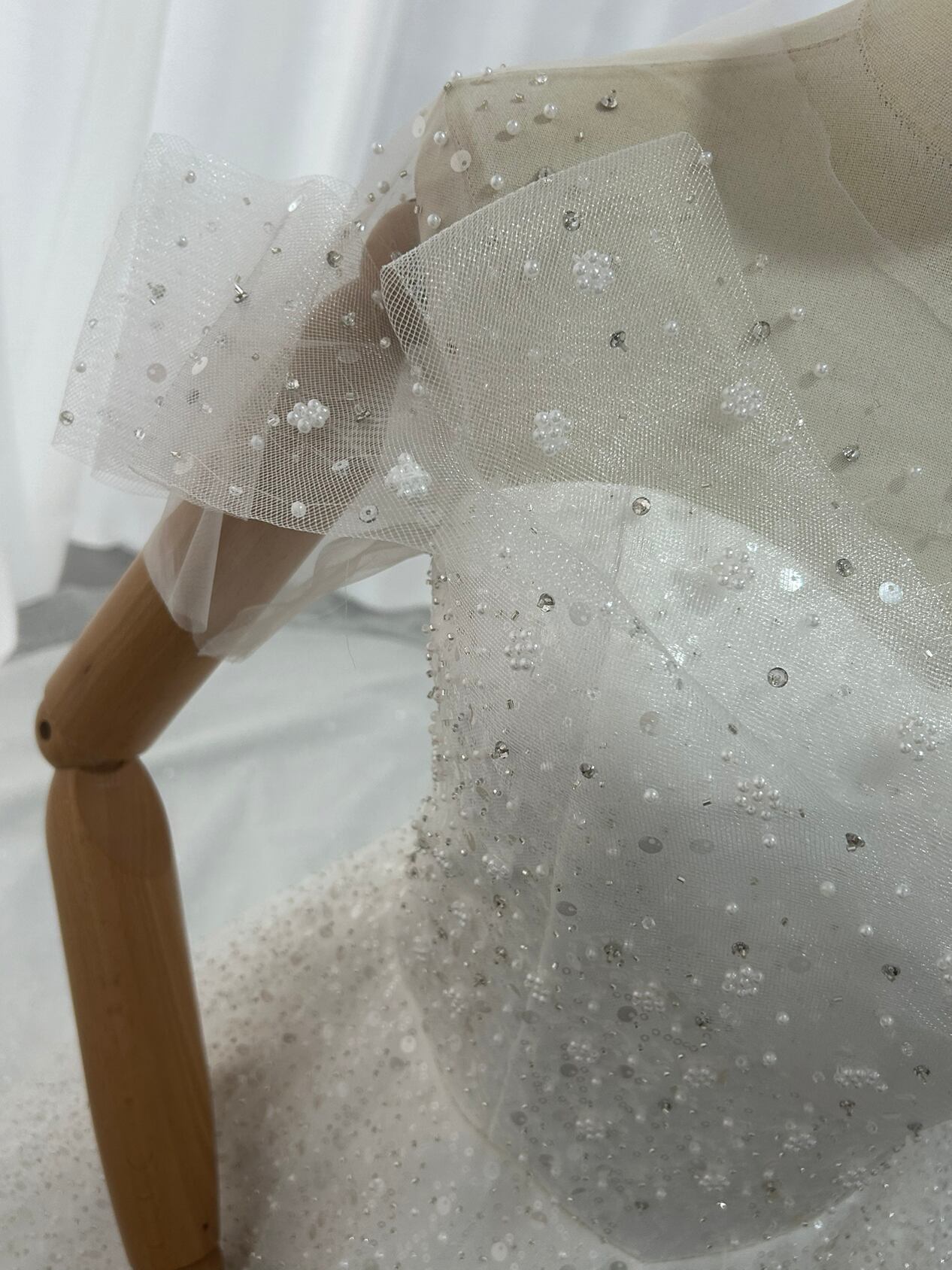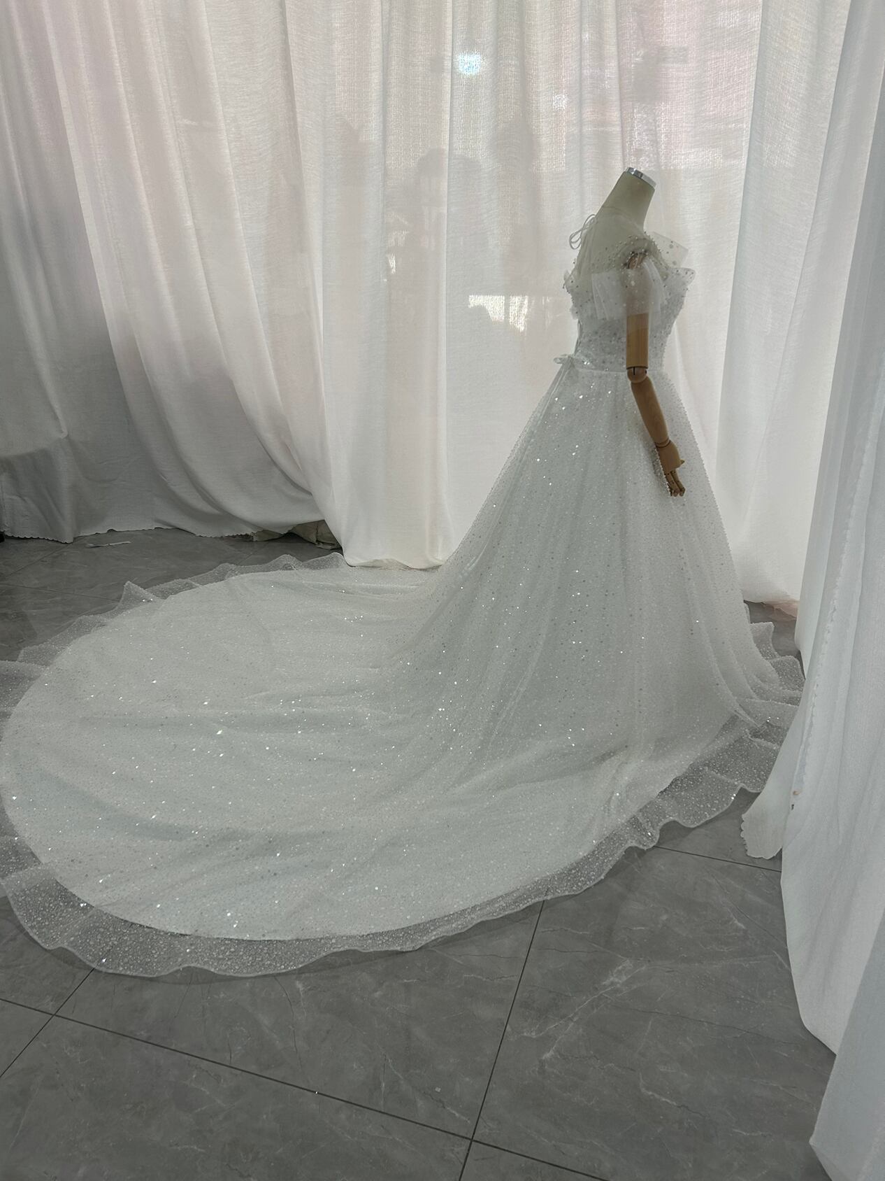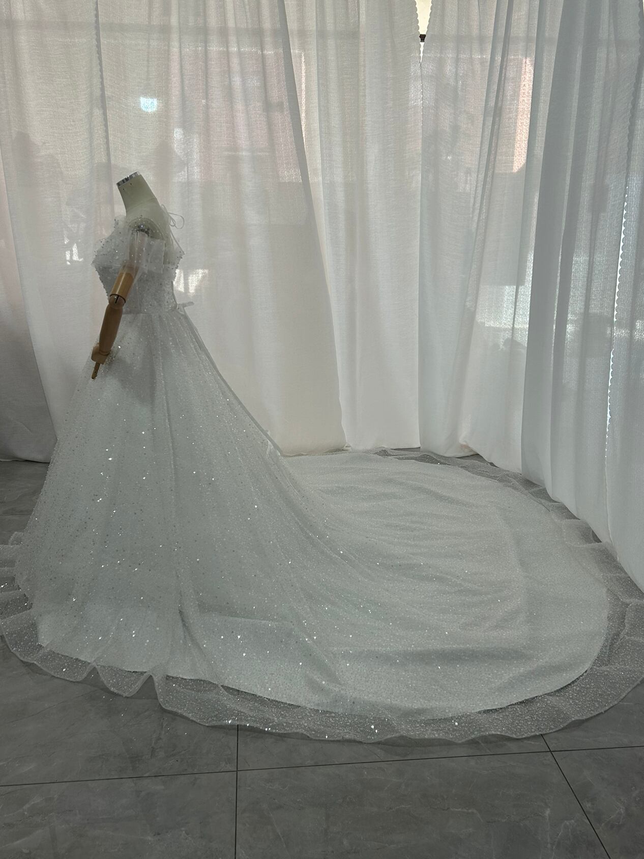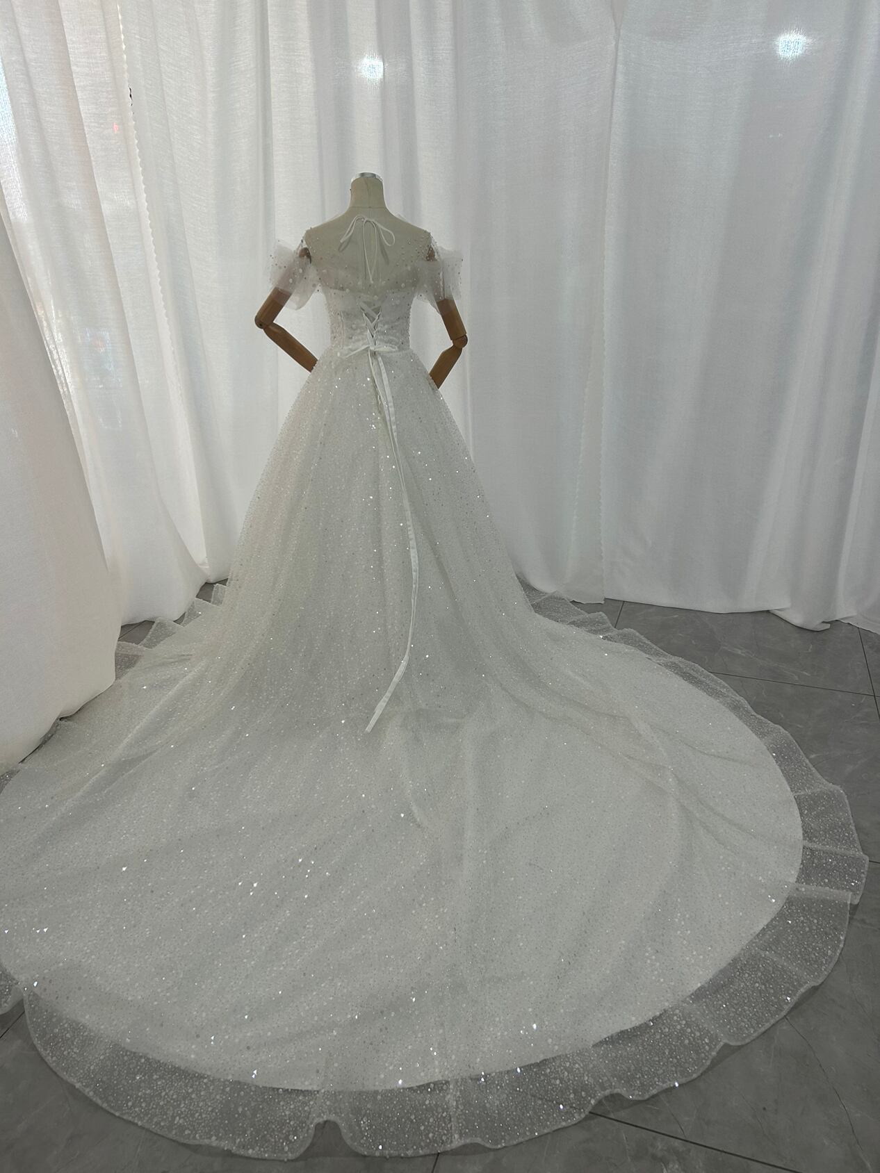 ウエディングドレス ホワイト パール ロングトレーン 短袖 ラウンドネック ソフトチュール 前撮り キラキラドレス