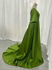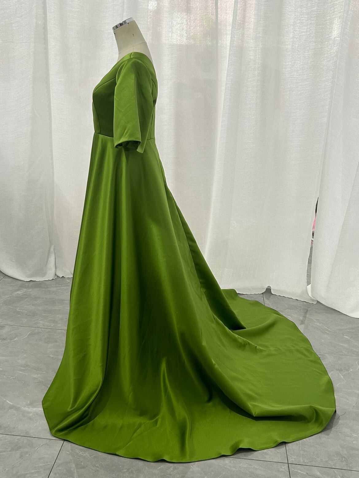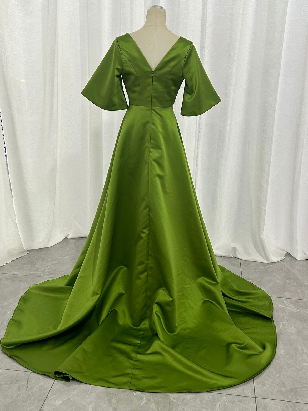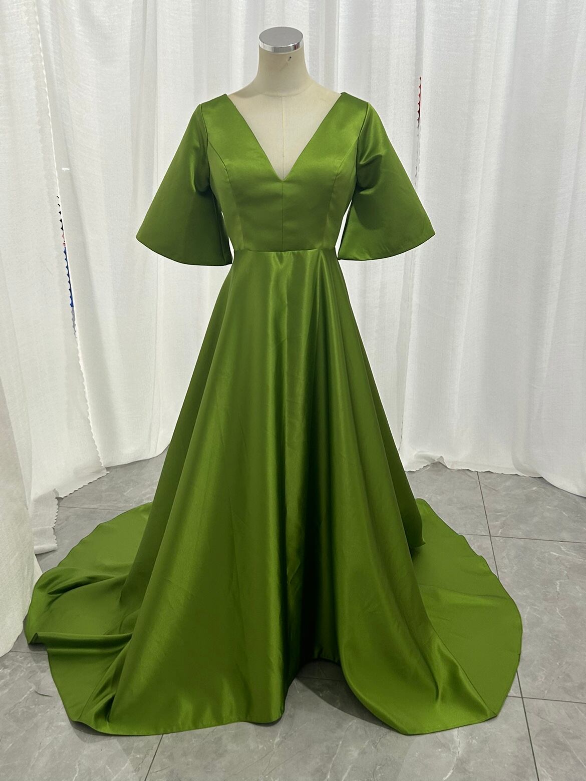 パーティードレス グリーン Vネックドレス ファスナー フリル袖 揺らめく裾 前撮り 派手な