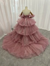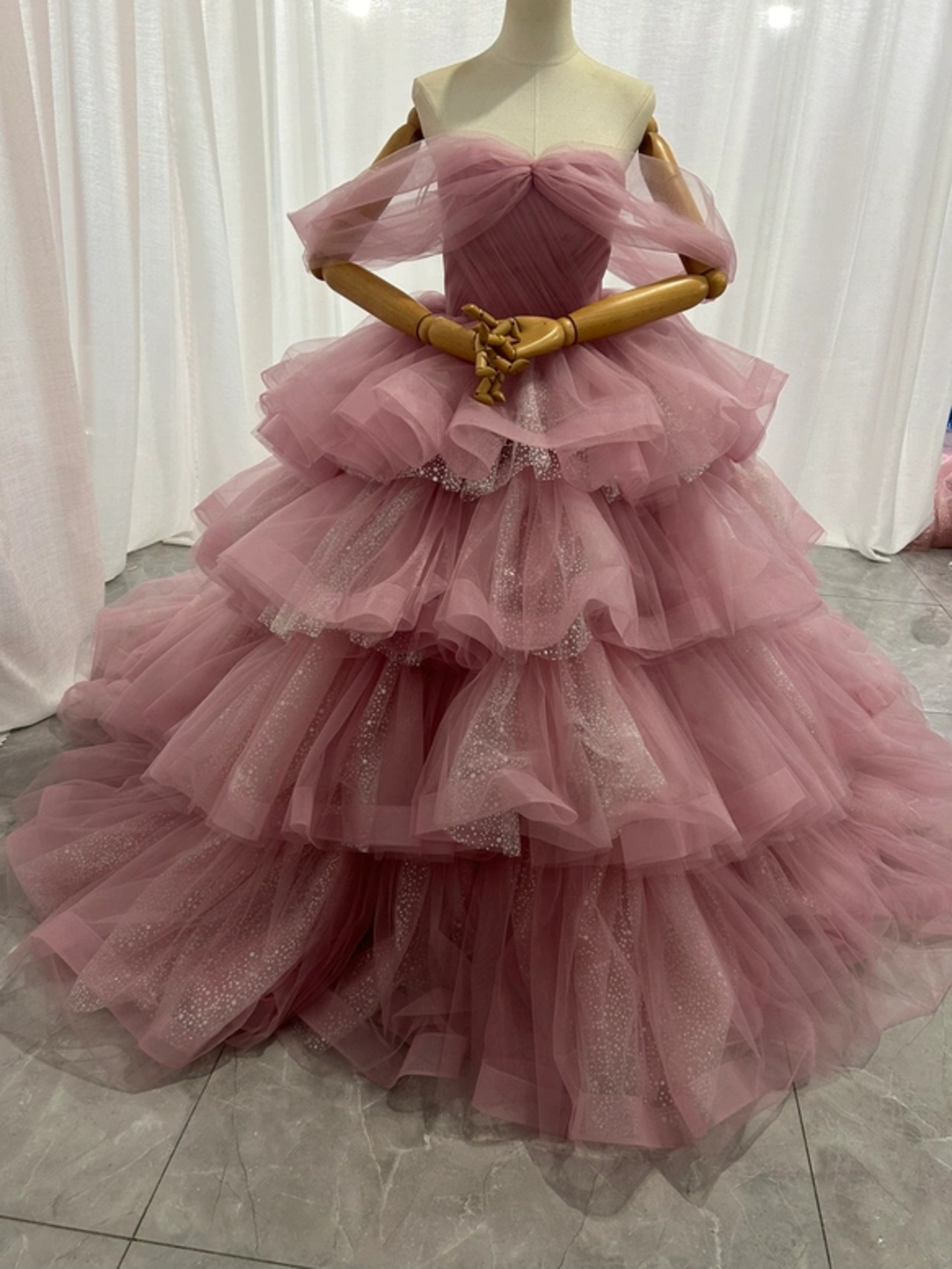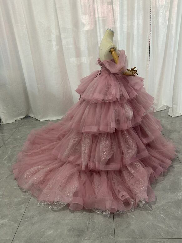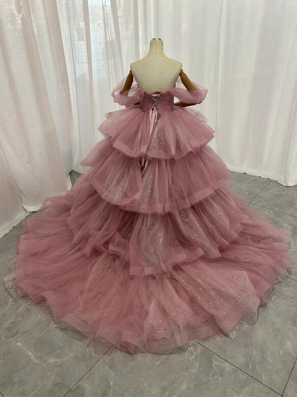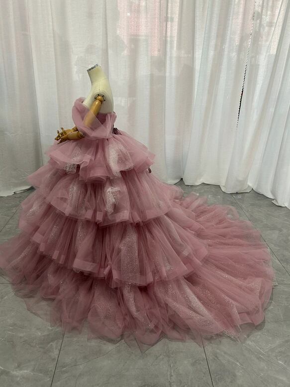 カラードレス ピンク オフショルダー キラキラチュール 柔らかく重ねたチュールスカート 披露宴