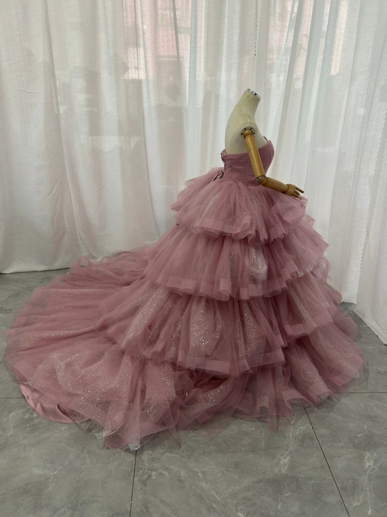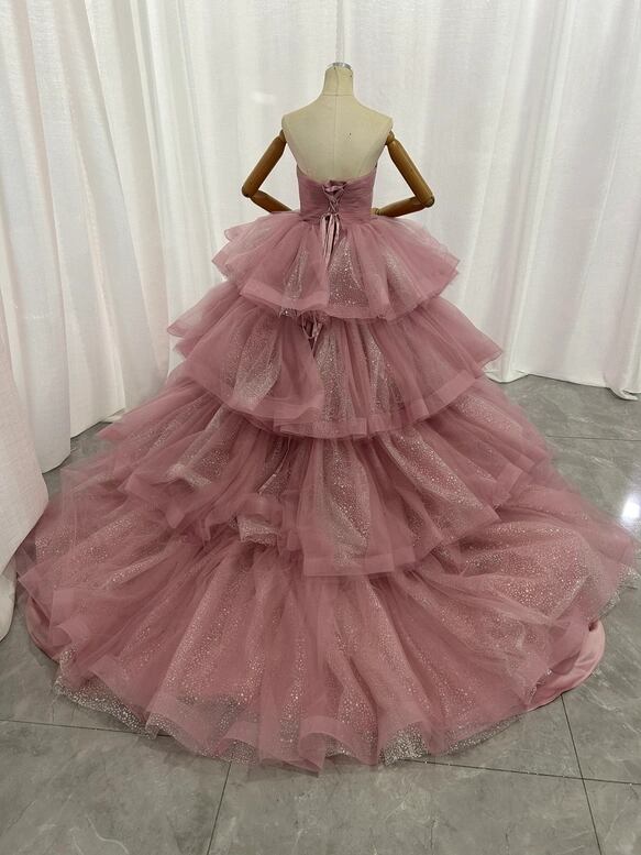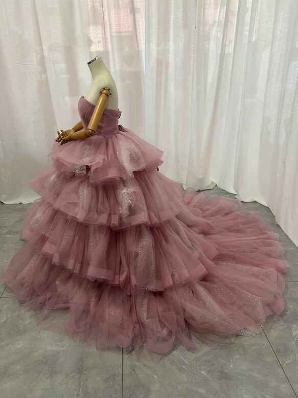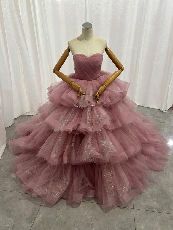 カラードレス ピンク ベアトップ キラキラチュール 柔らかく重ねたチュールスカート 披露宴