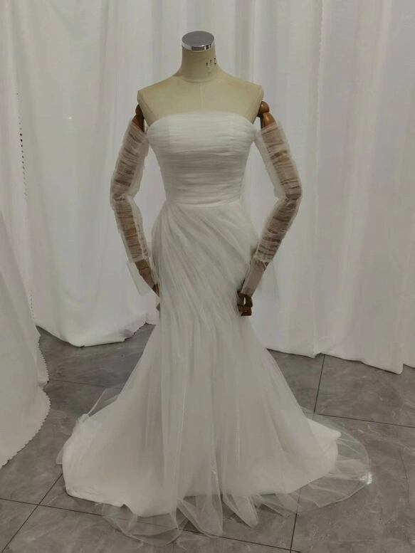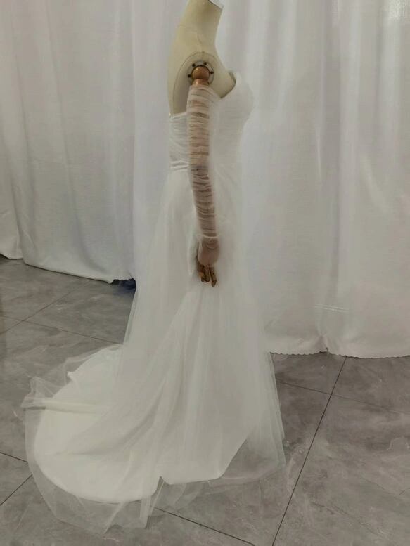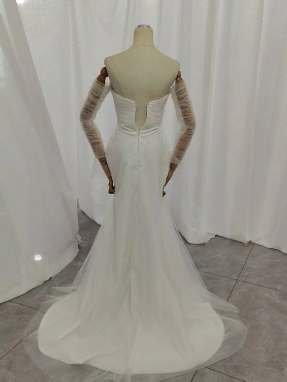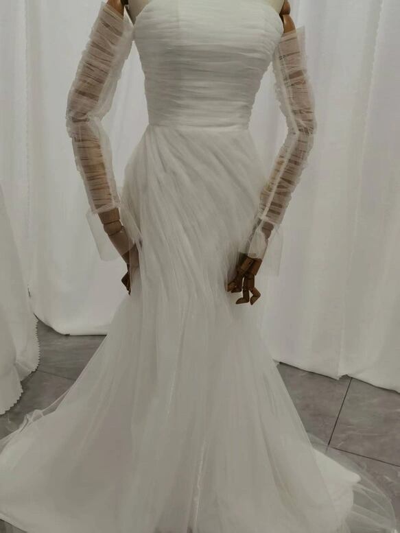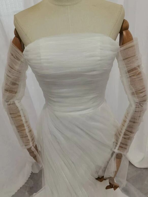 上品 ソフトチュール 取り外し袖 オフホワイト クレープ生地 ベアトップ ウエディングドレス 2次会 花嫁 挙式