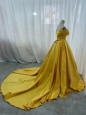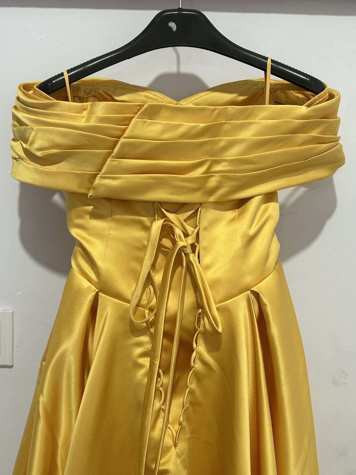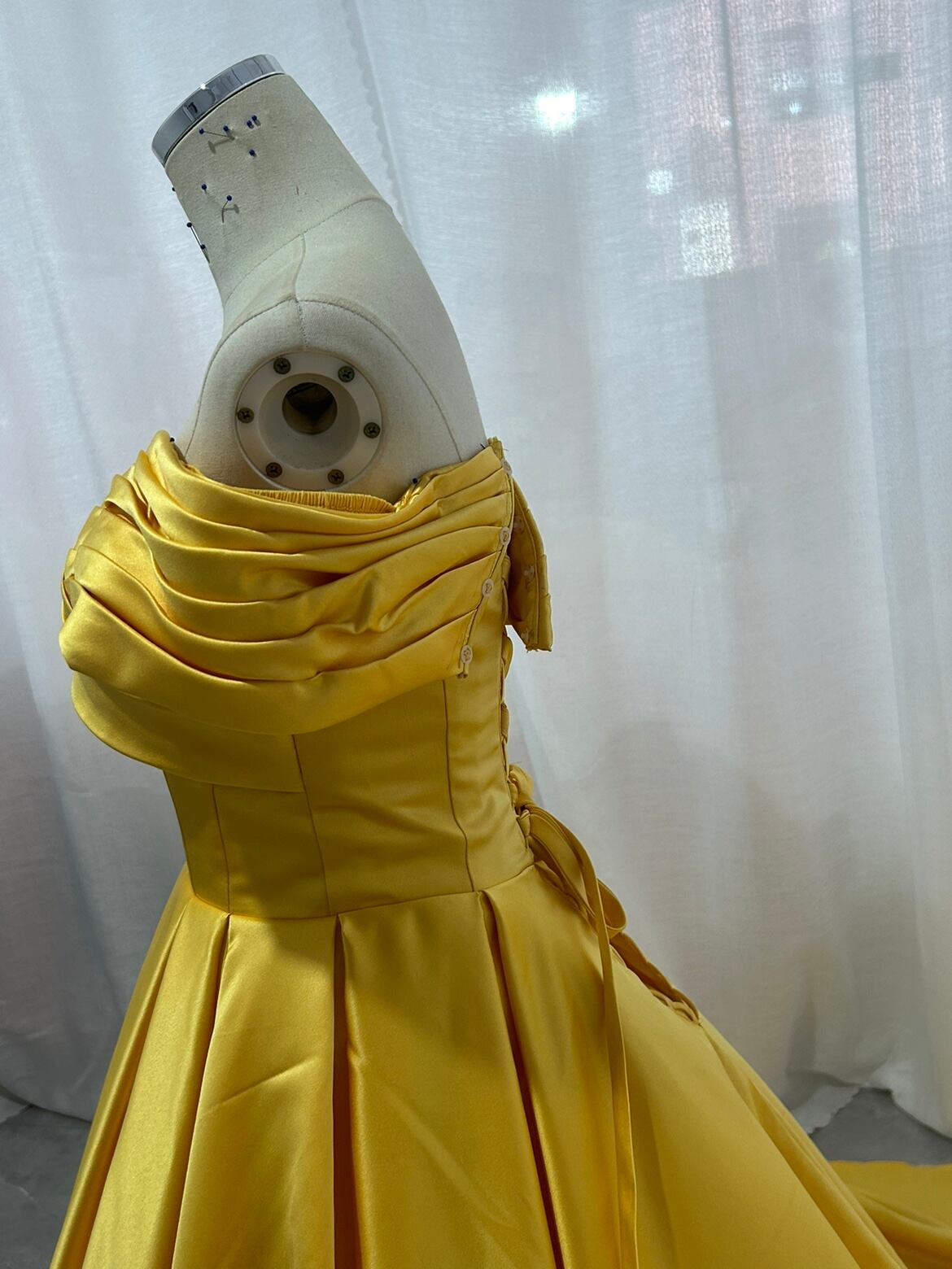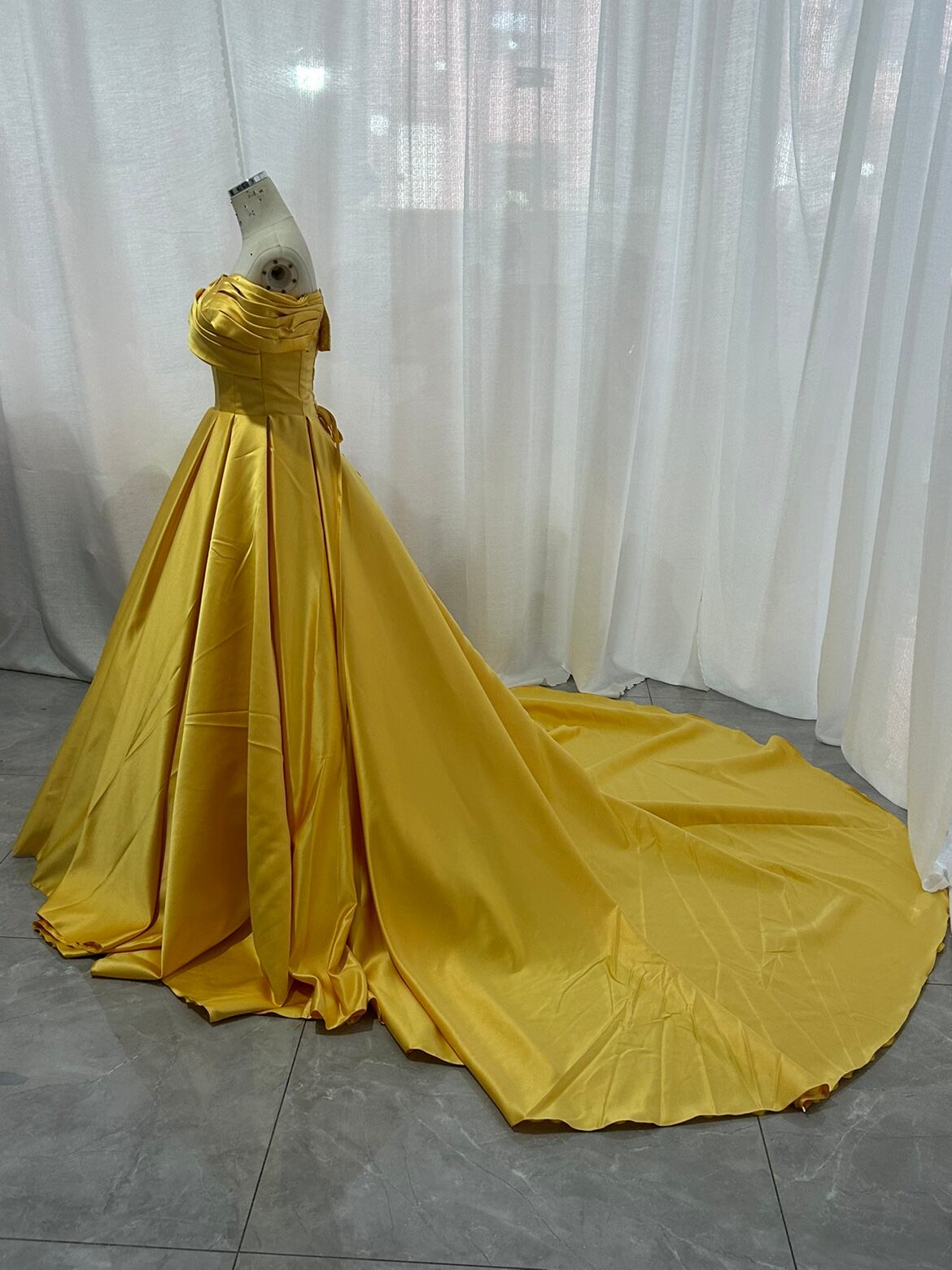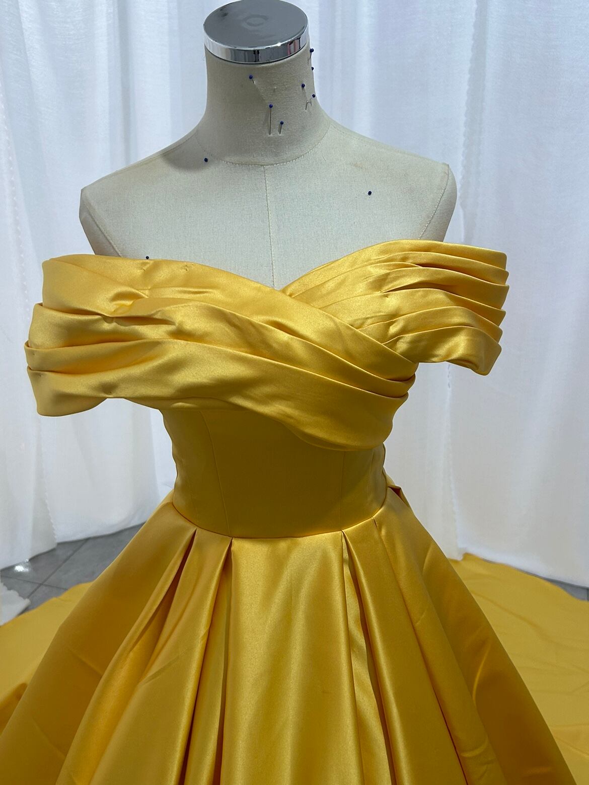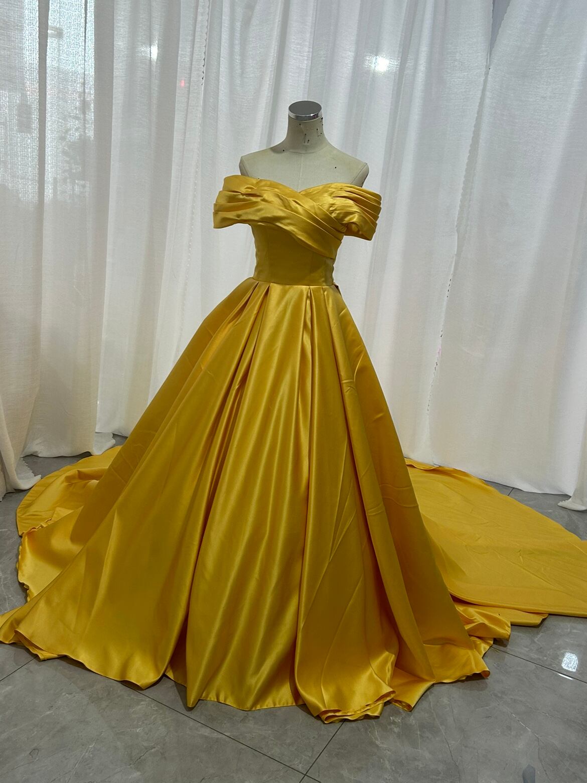 カラードレス 鬱金色 オフショルダー ふっくら柔らかなバックリボン くるみボタン 光沢感 結婚式