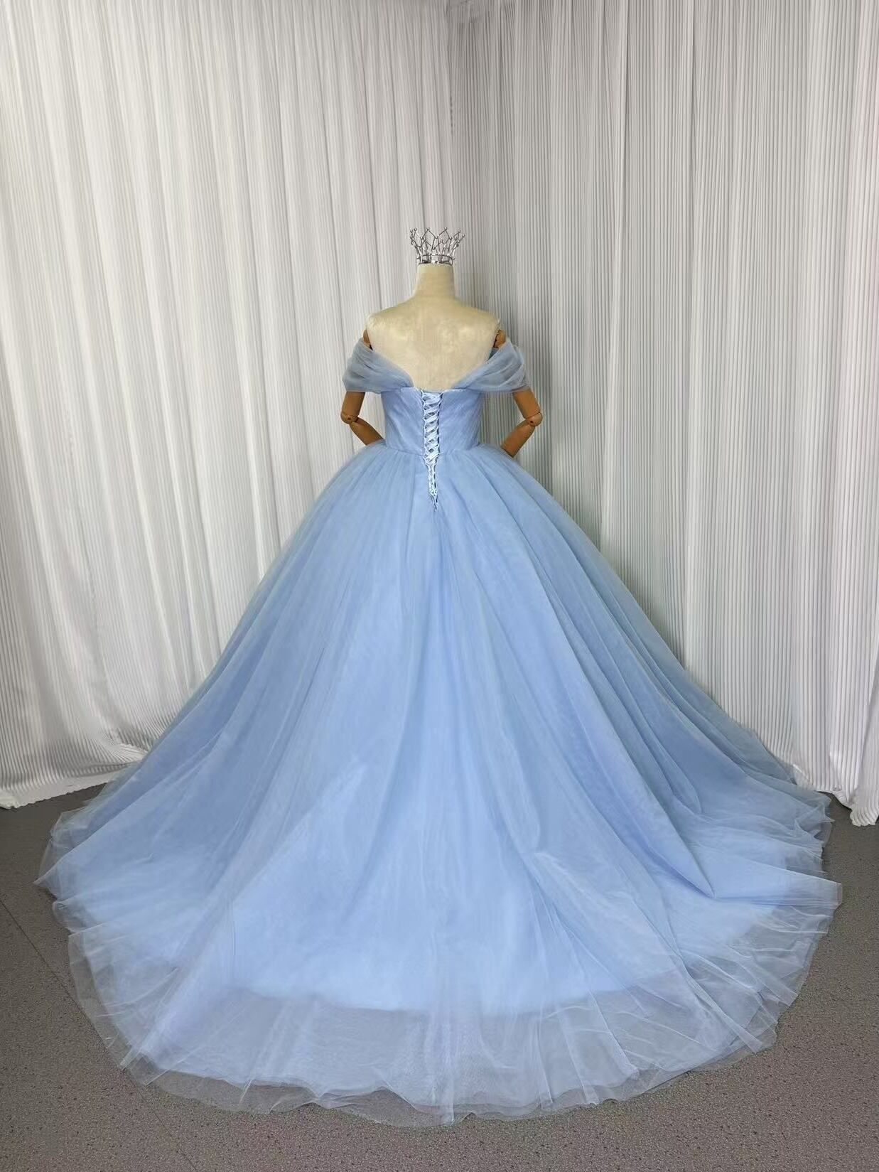カラードレス オフショルダー 爽やかで優しいブルー 柔らかく重ねたチュールスカート プリンセスライン