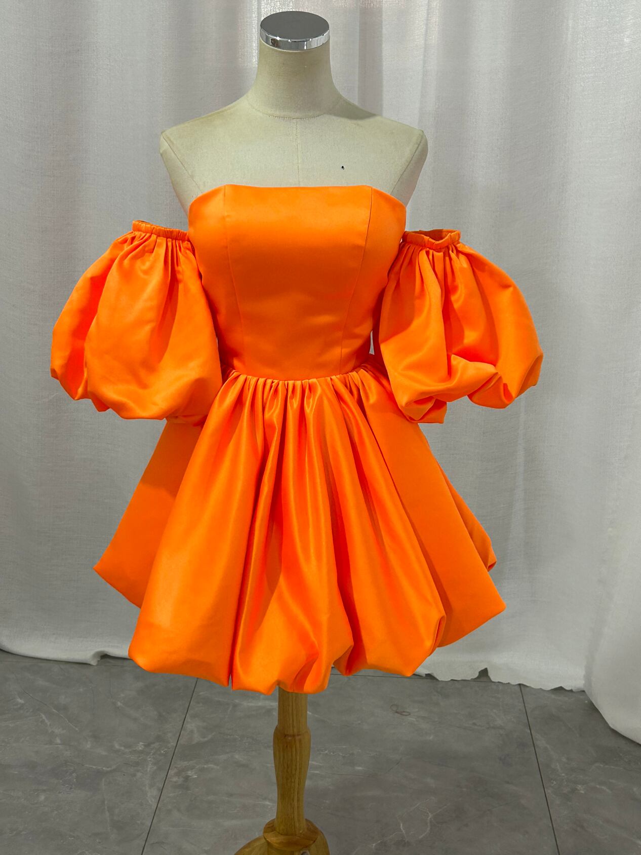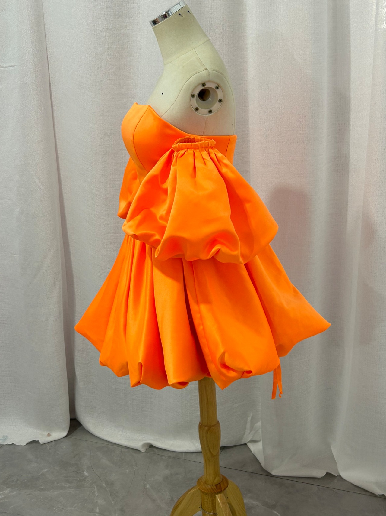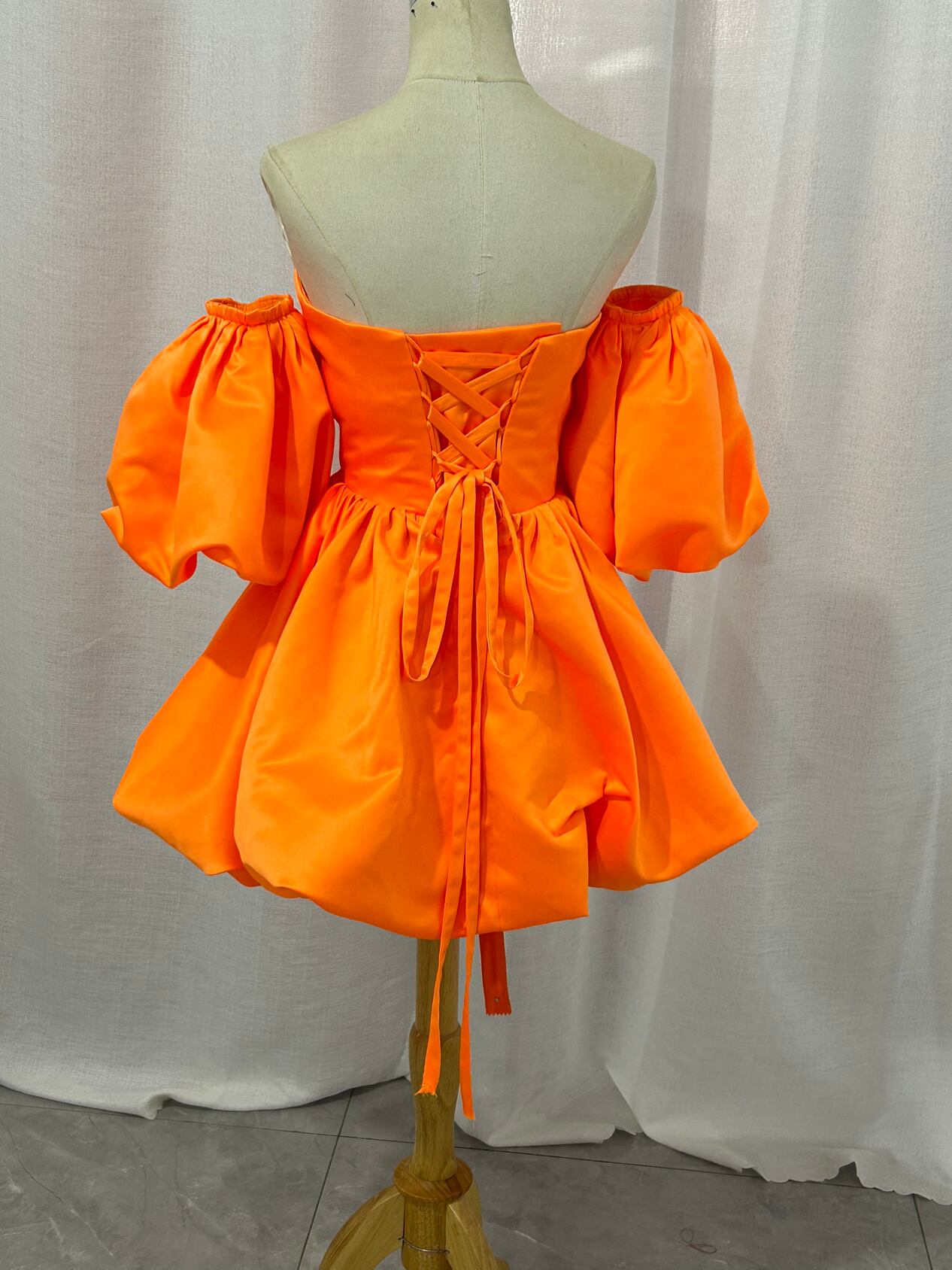 パーティードレス ミニワンピース パフスリーブ 編み上げ 光沢サテン オレンジ 色直し 前撮り
