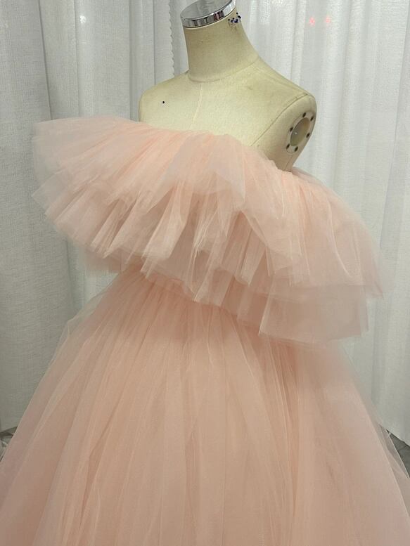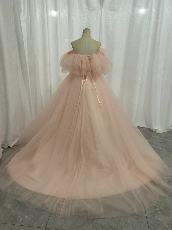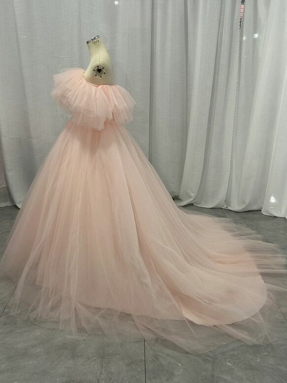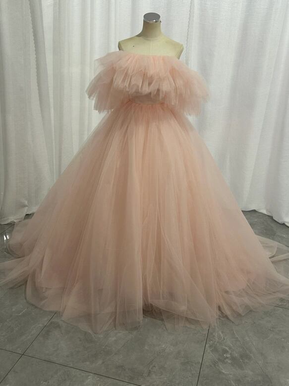 カラードレス 薄ピンク オフショルダー チュールスカート ボリュームドレス 花嫁
