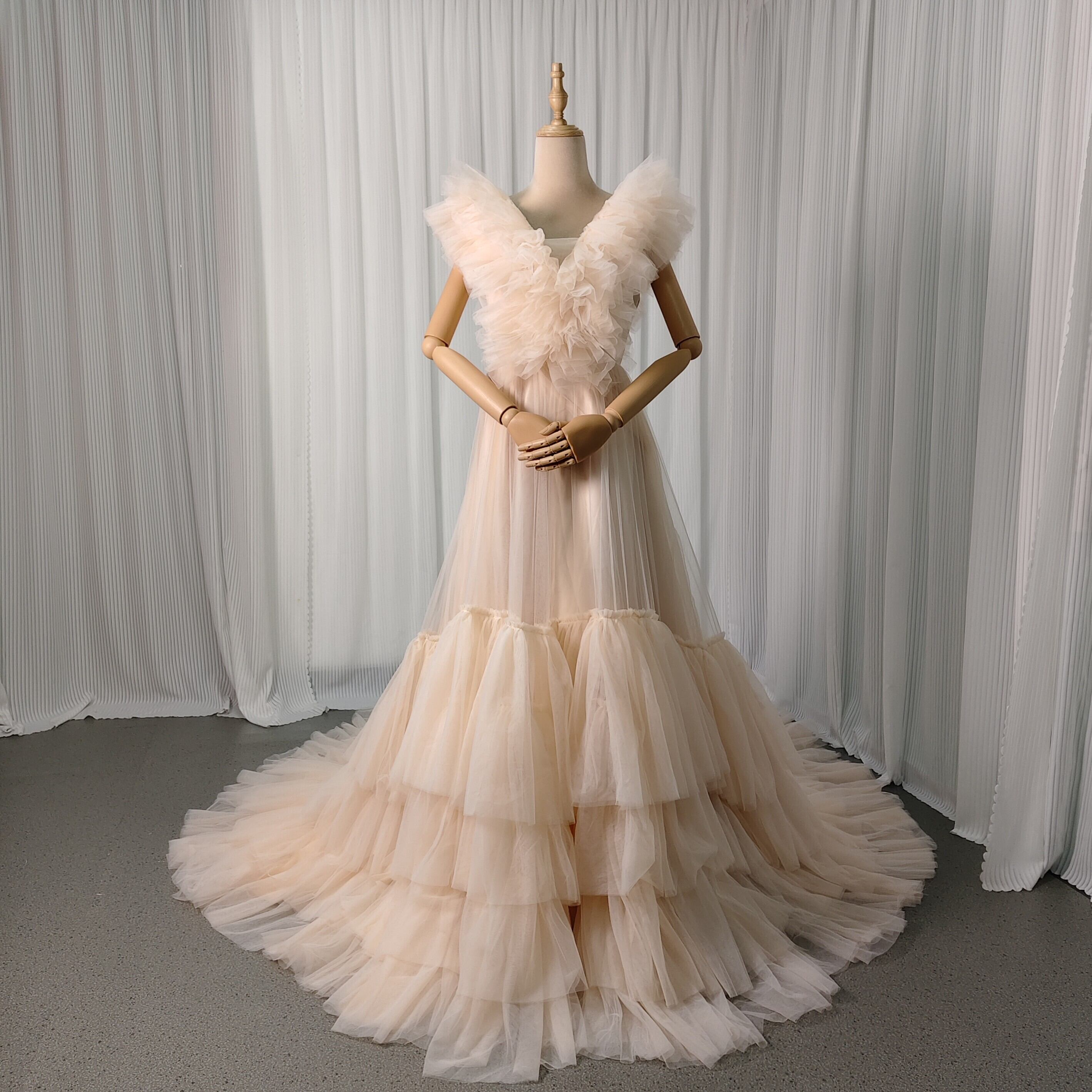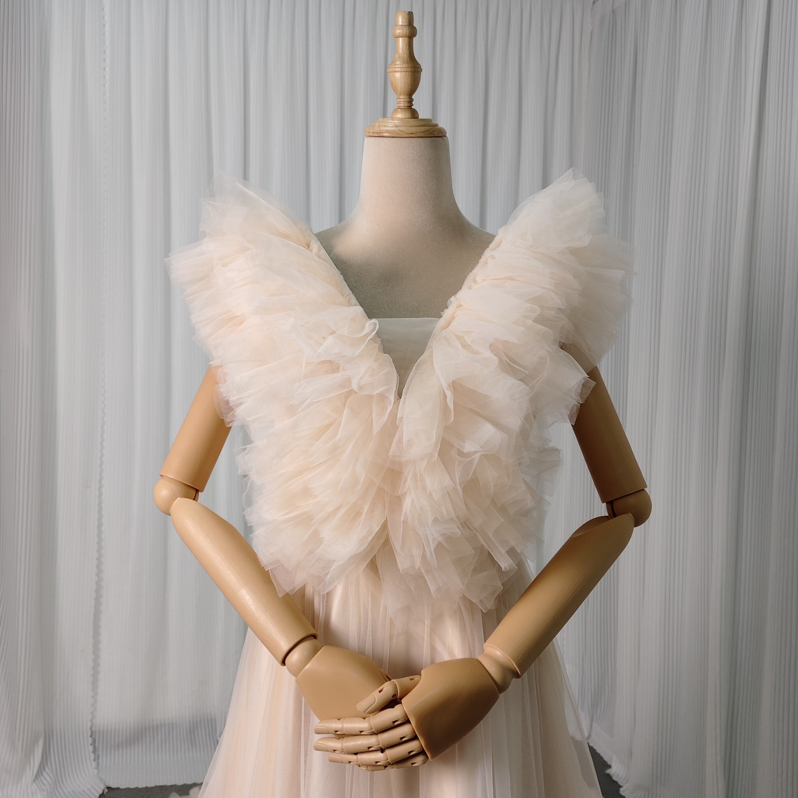 カラードレス 薄シャンパン色 オンショルダードレス リボントレーン プリンセスライン 花嫁