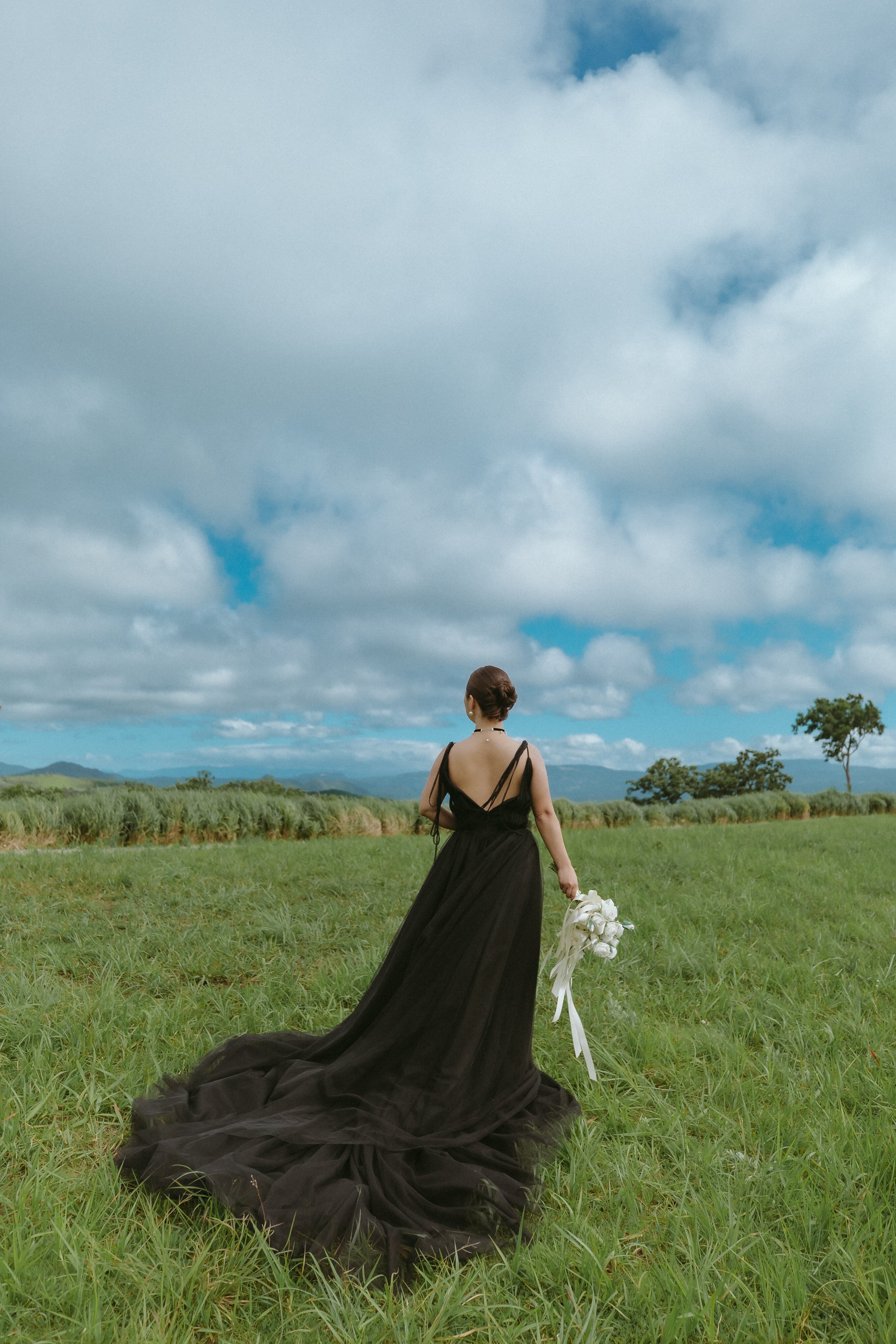 実例写真!パーティードレス Vネック キャミソール ブラック ファスナー 柔らかく重ねたチュールスカート 前撮り