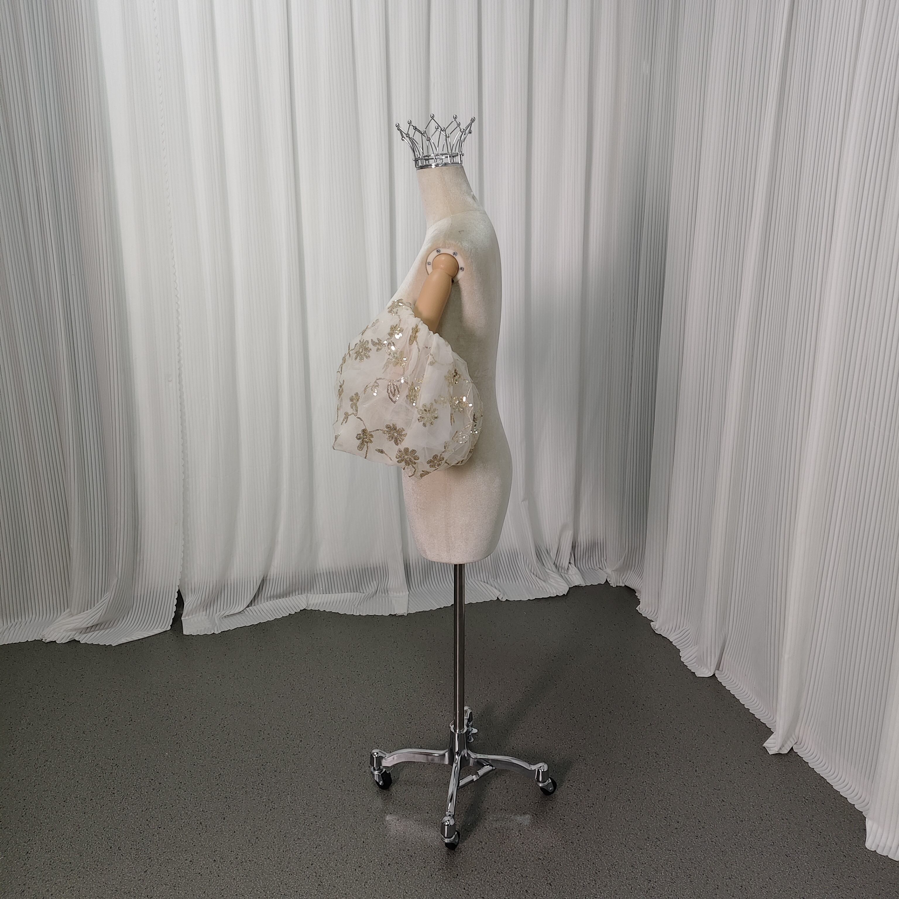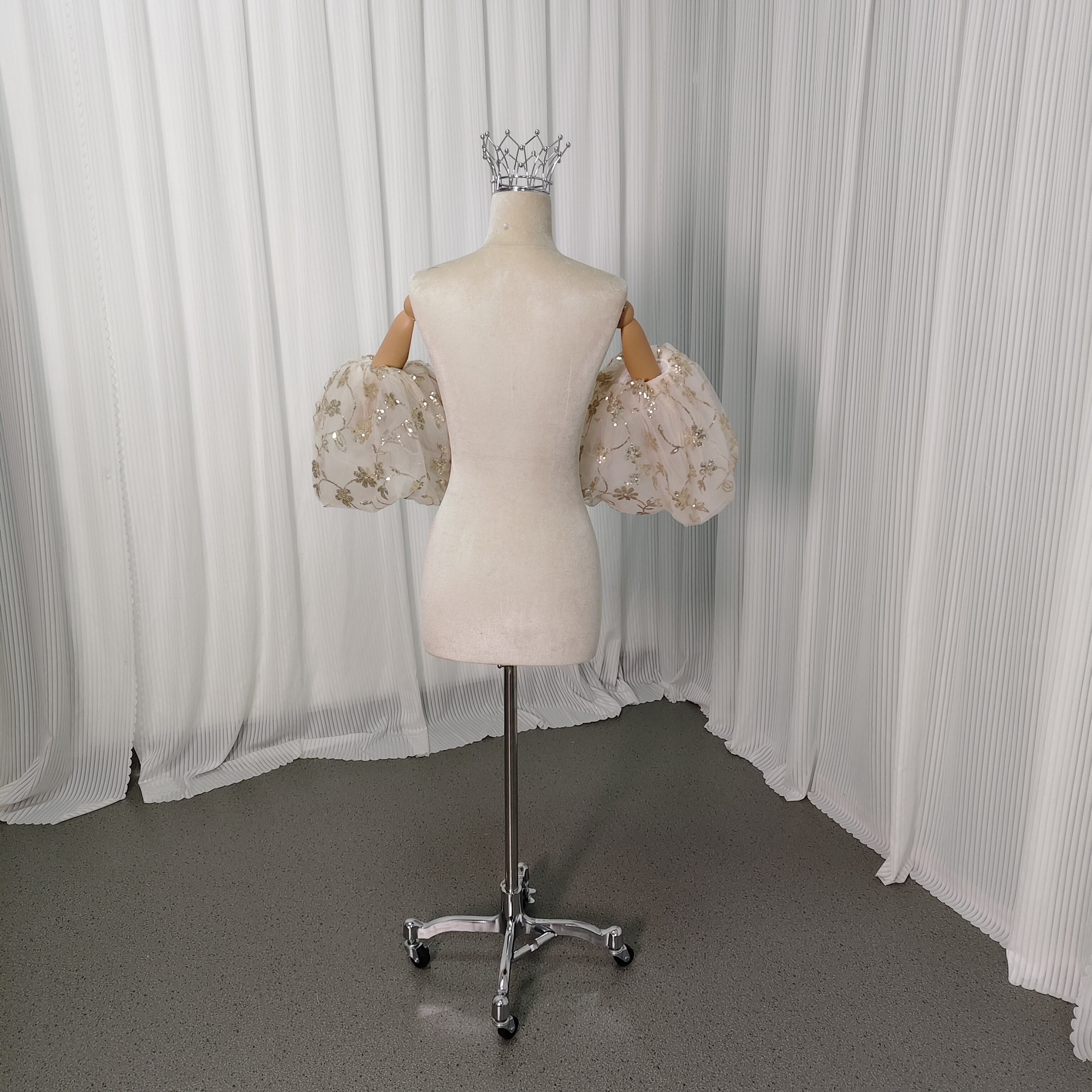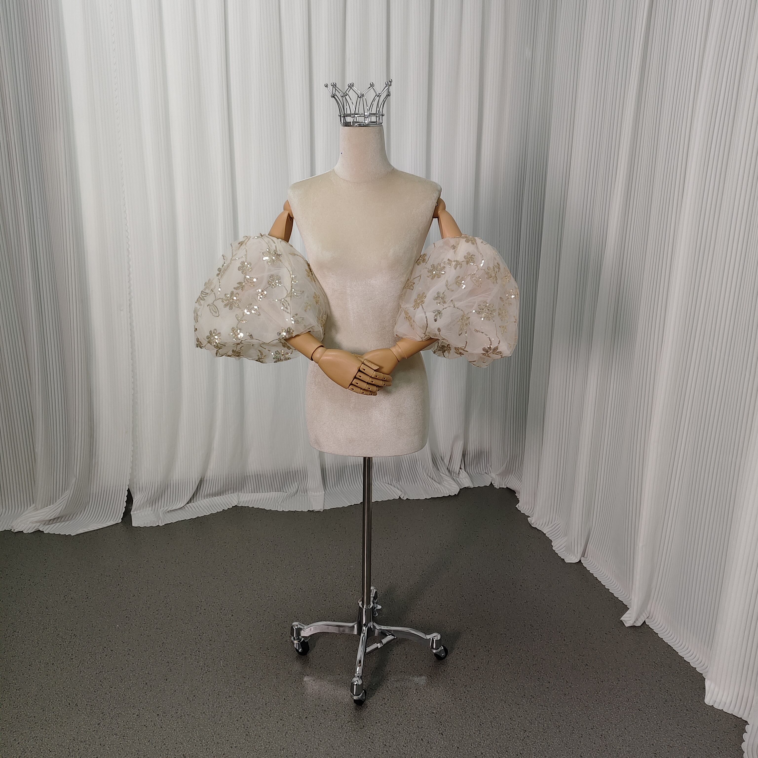 パフスリーブ 薄シャンパン色 キラキラスパンコール レース ストレッチ 花嫁/ウェディングドレス