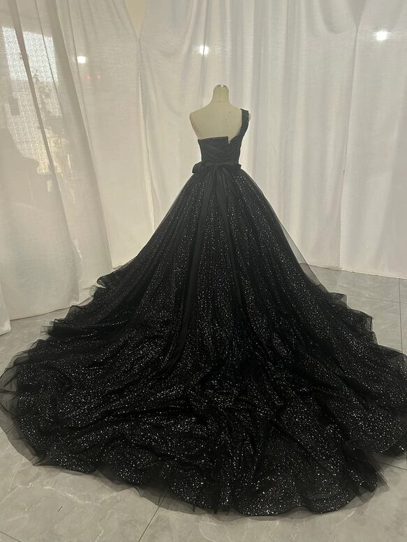 送料無料!高品質! 黒 ワンショルダー キラキラチュール カラードレス パーティードレス 黒 細見えシ