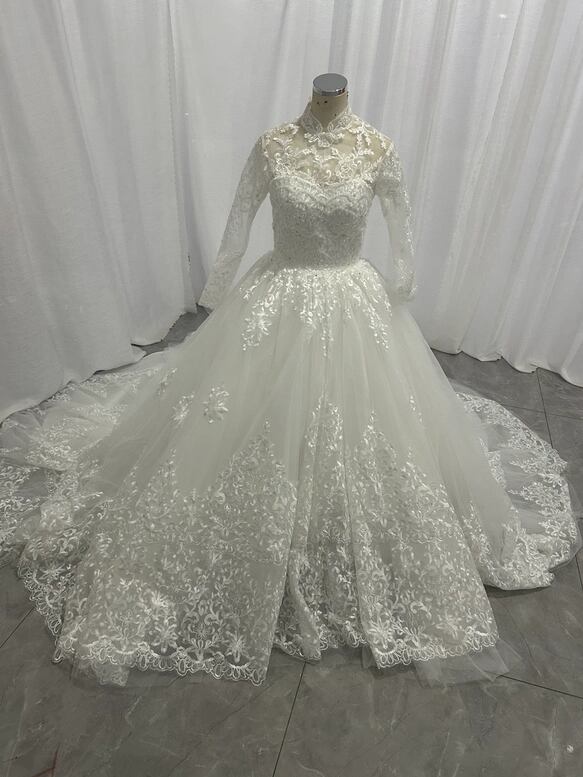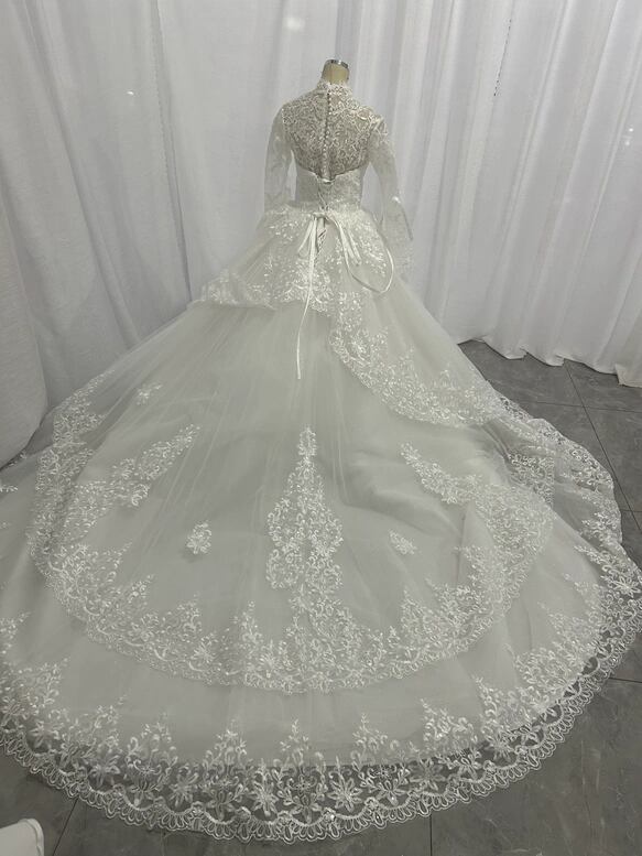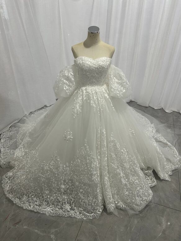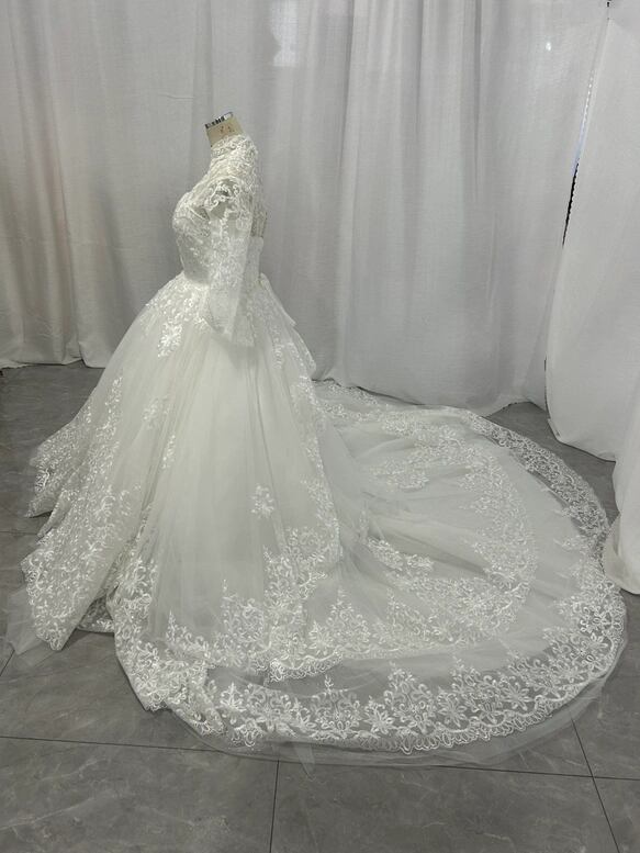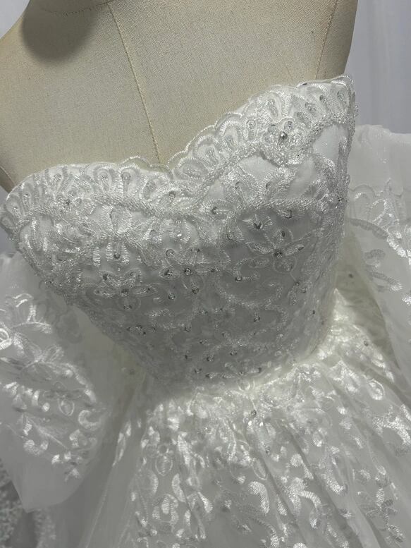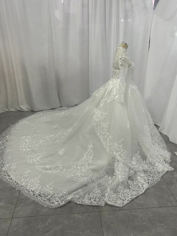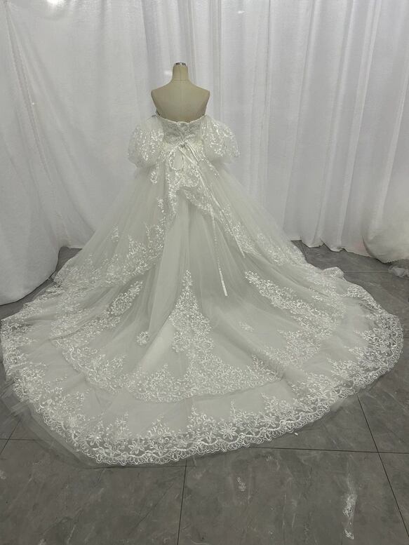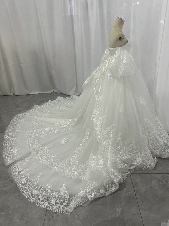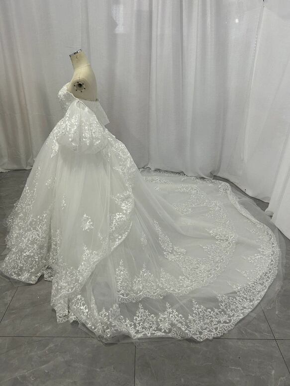 送料無料!オフホワイト レース刺繍たっぷり ウエディングドレス 華やかなトレーン 3D立体レース刺繍