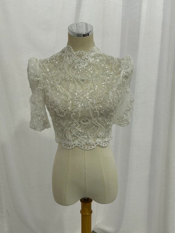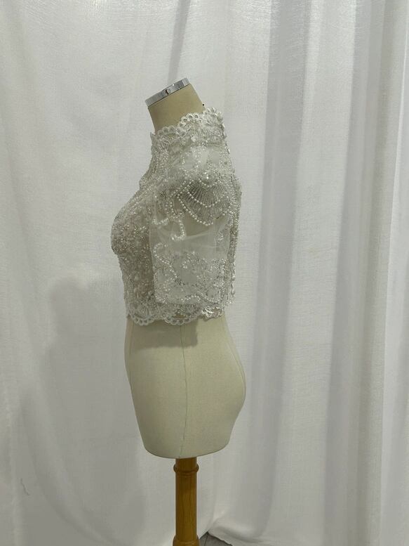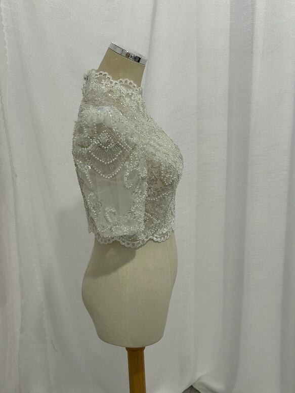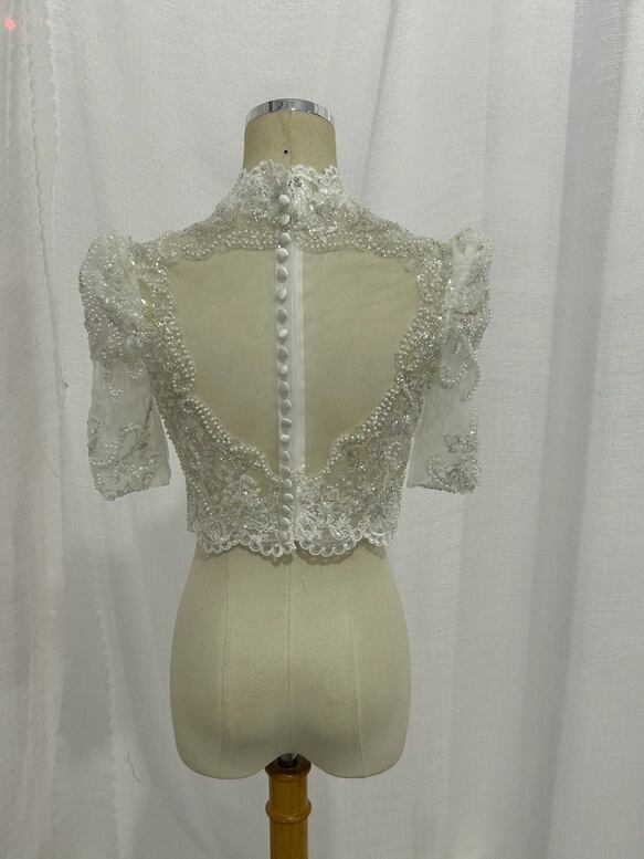 ボレロ 短袖 くるみボタン キラキラ光る刺繍 背中見せ デザイン感 結婚式