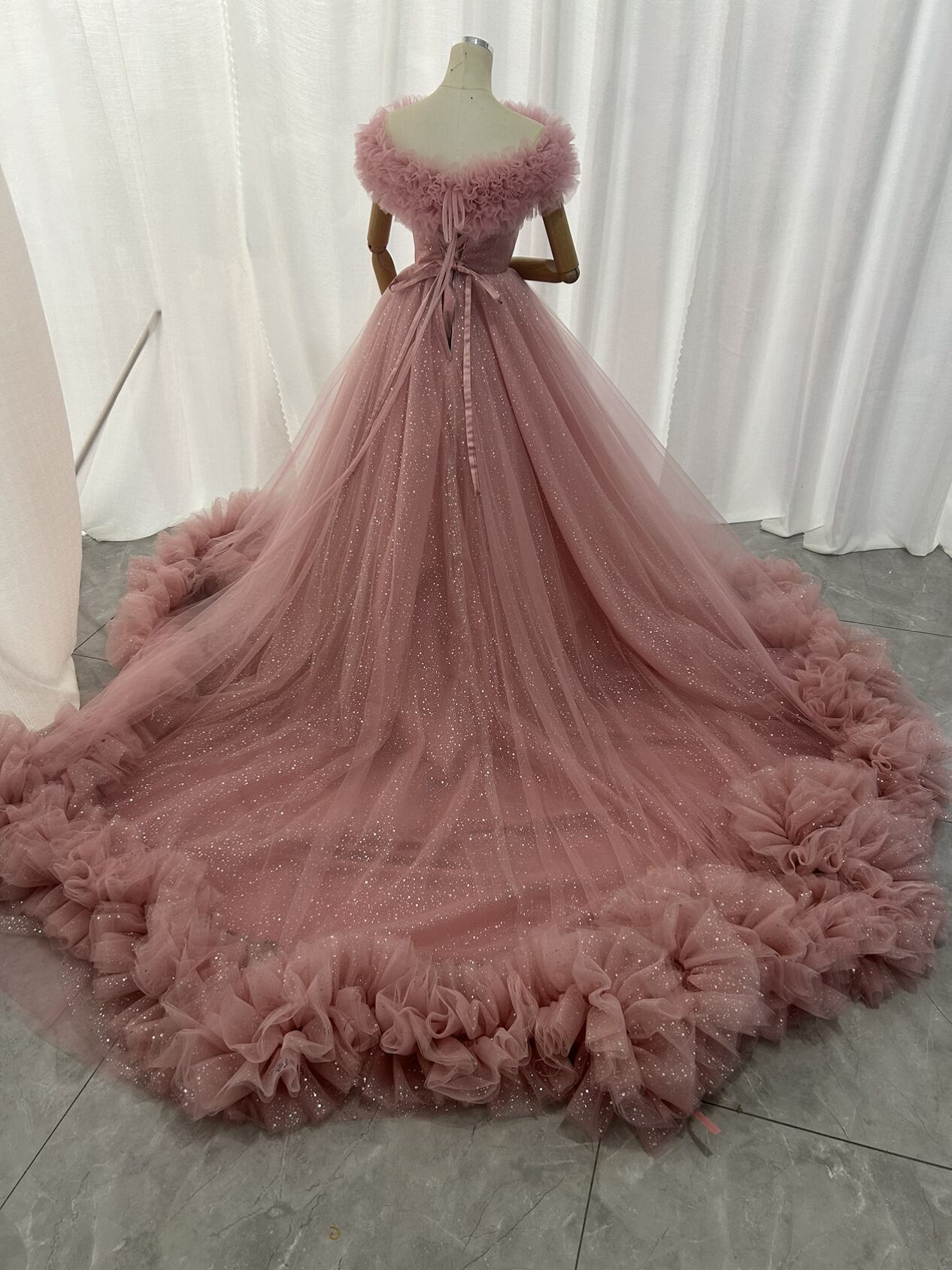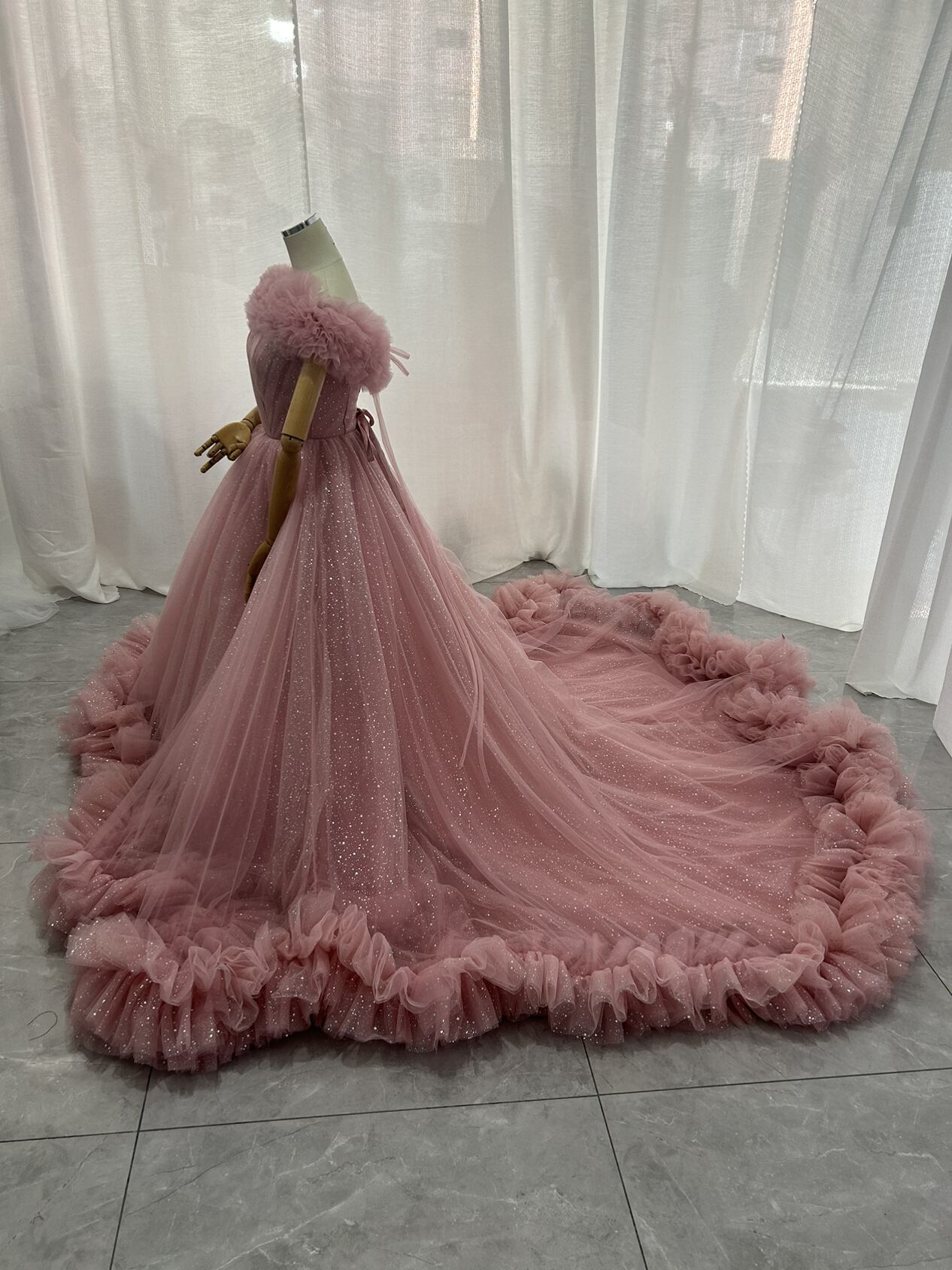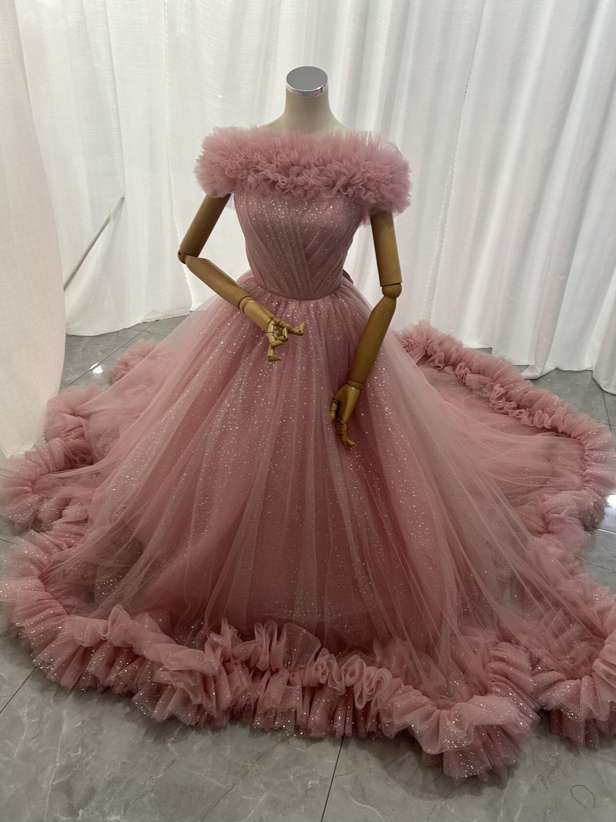 カラードレス ピンク 取り外し可能なオフショルダー キラキラチュール リボントレーン ブライダル 結婚式