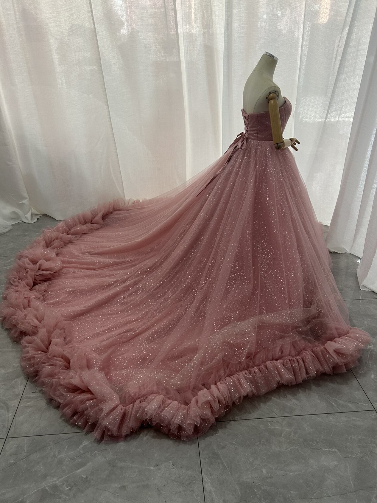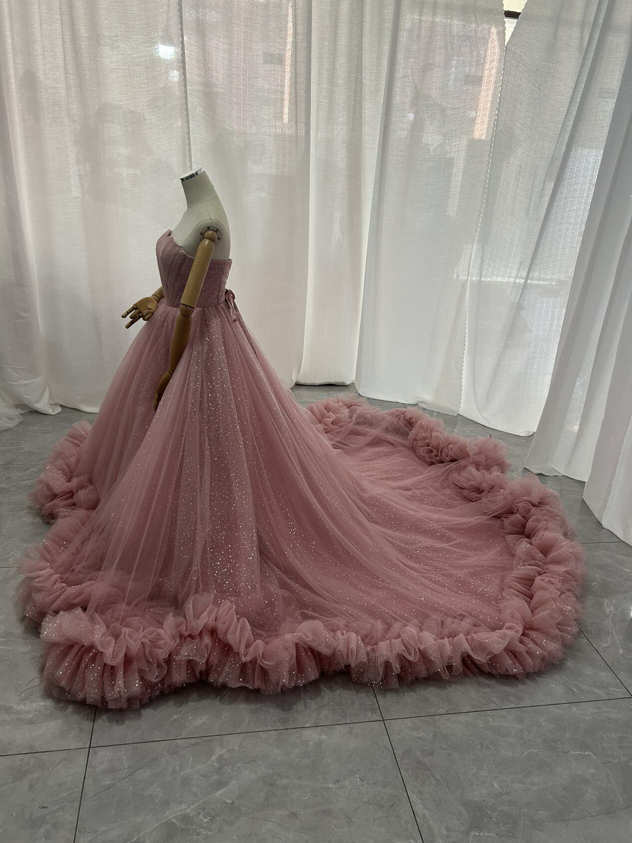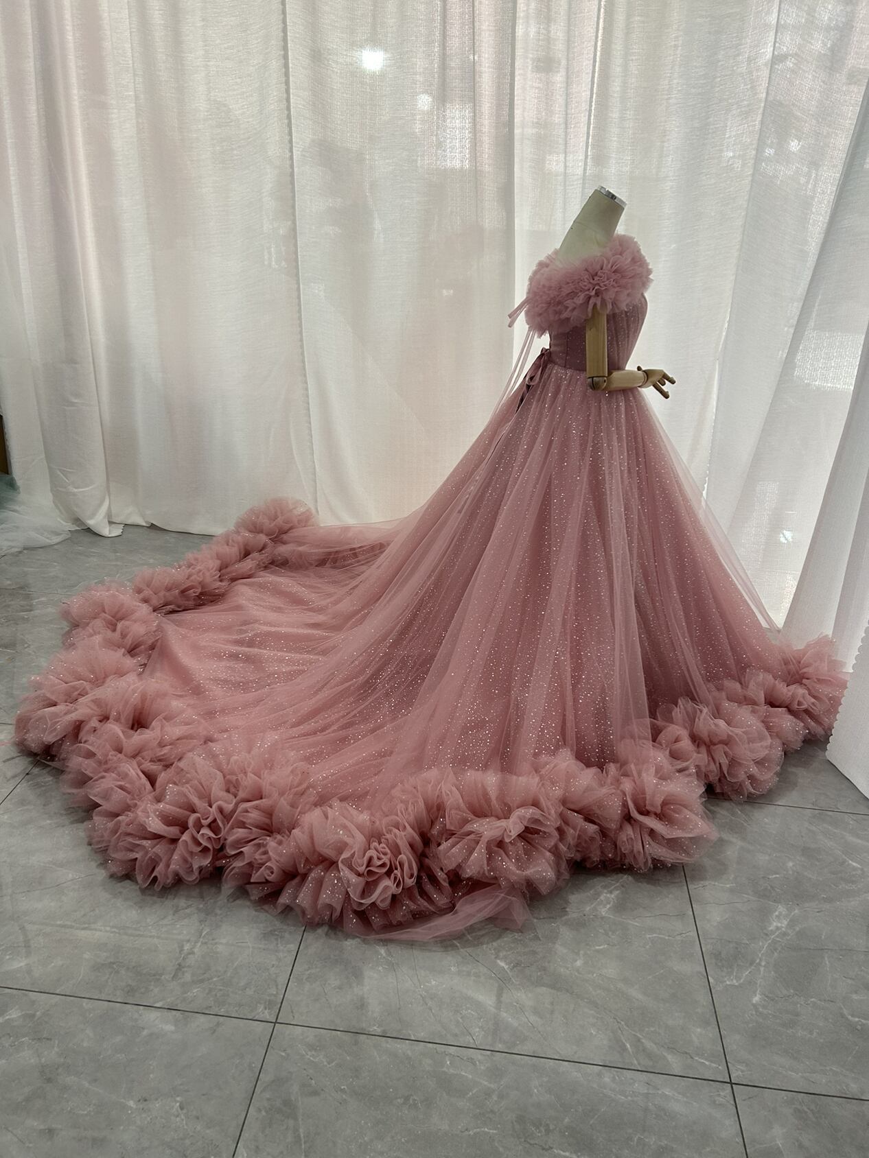 カラードレス ピンク 取り外し可能なオフショルダー キラキラチュール リボントレーン ブライダル 結婚式