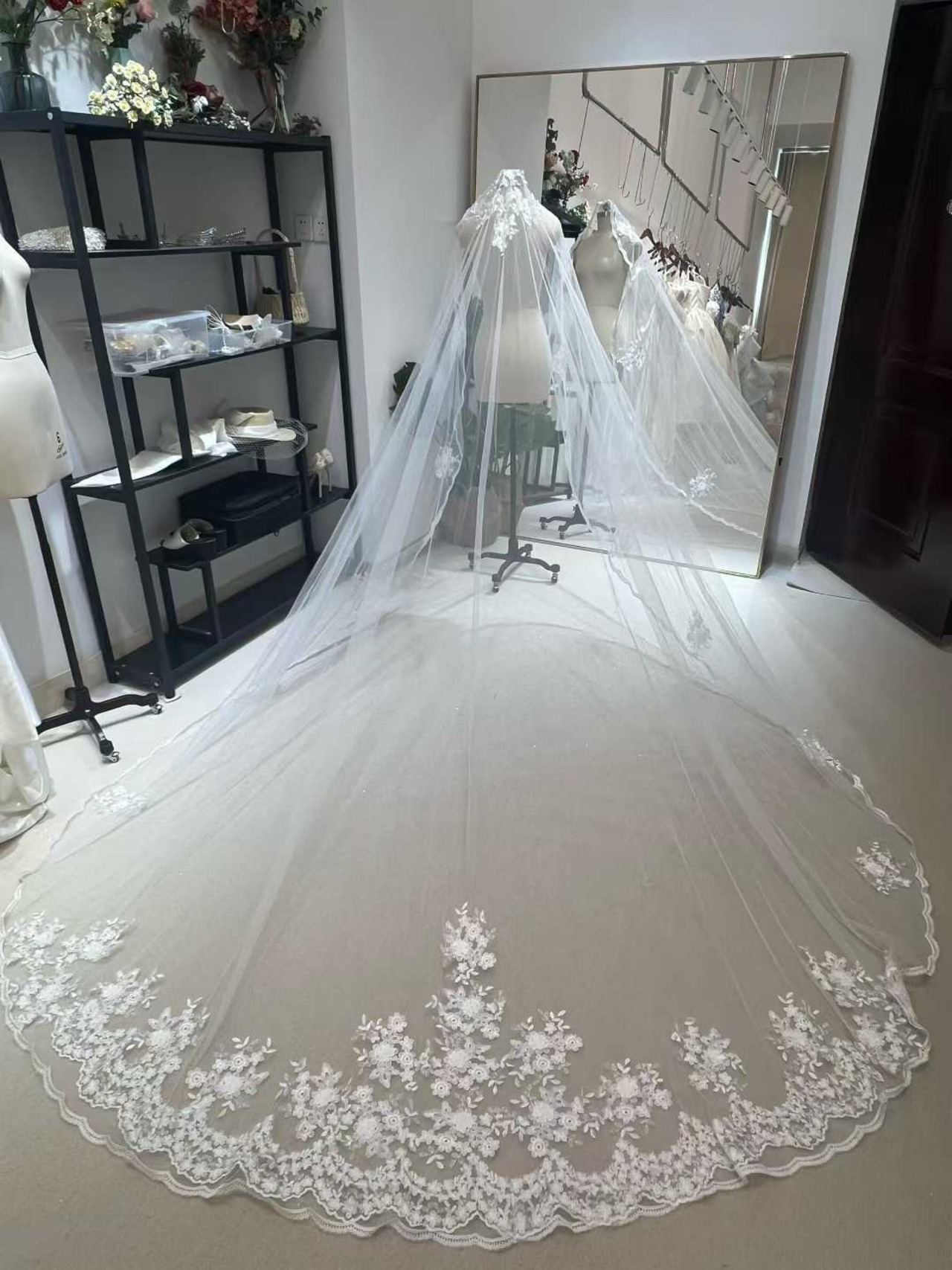ロングベール ウェディングドレス ソフトチュール 3D立体レース刺繍 オフホワイト 結婚式