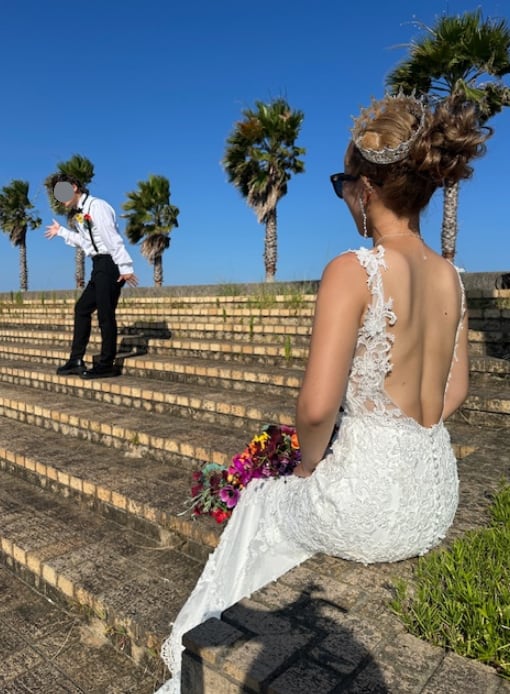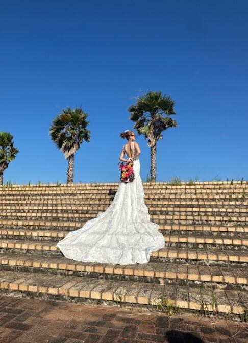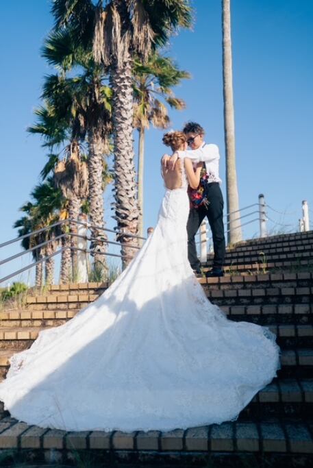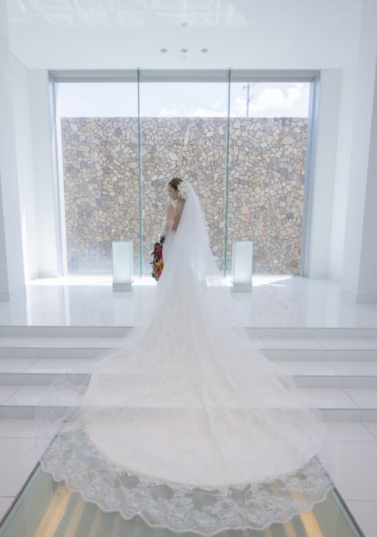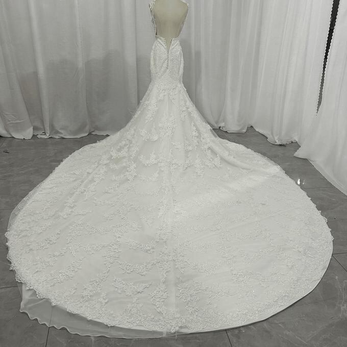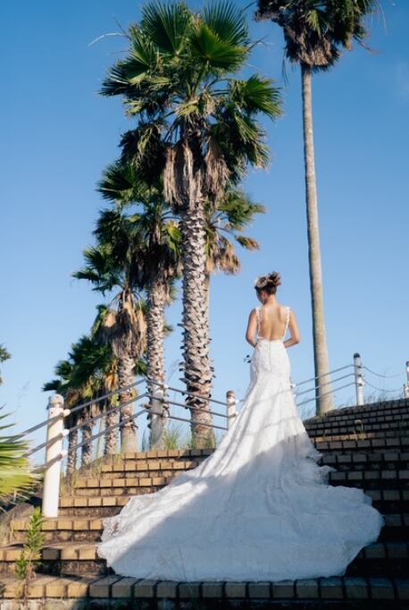 実例写真!ウェディングドレス キャミソール 贅沢な総レース 華やかなトレーン 背中見せ 抜群のおしゃれ見え ブライダル