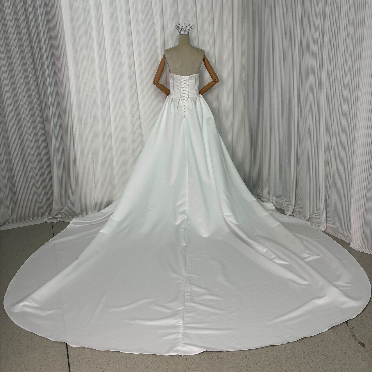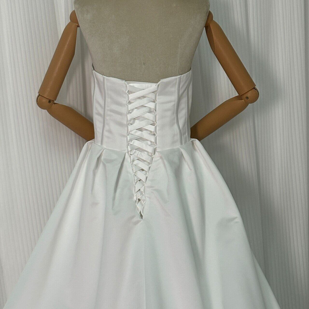 ウエディングドレス ベアトップ 光沢サテン ビスチェタイプ オフホワイト 色直し 結婚式 ロングトレーン