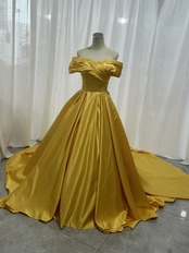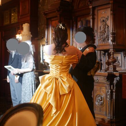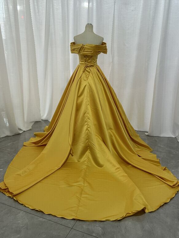 実例写真!カラードレス イエロー オフショルダー ふっくら柔らかなバックリボン くるみボタン 光沢感 結婚式
