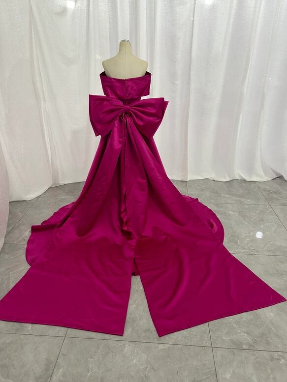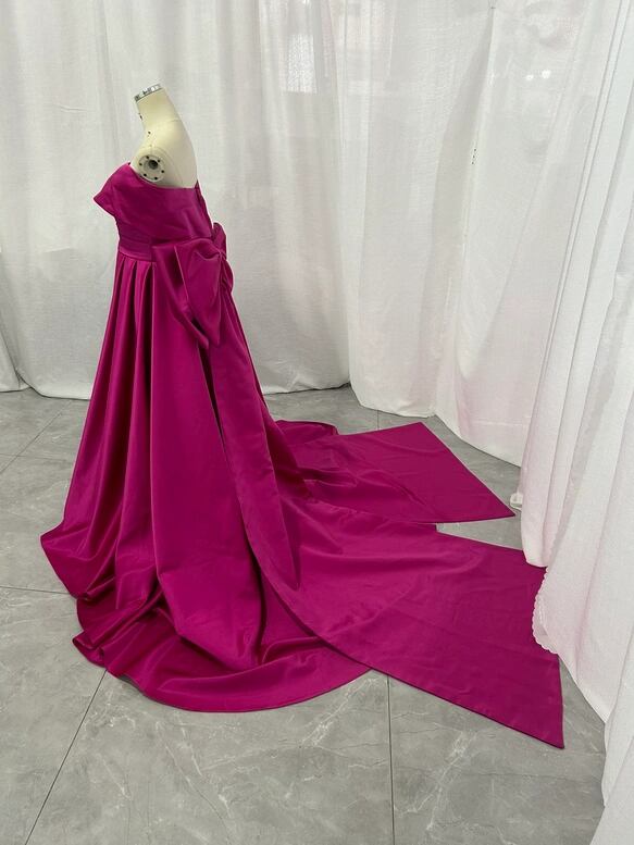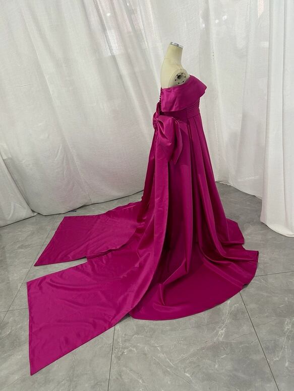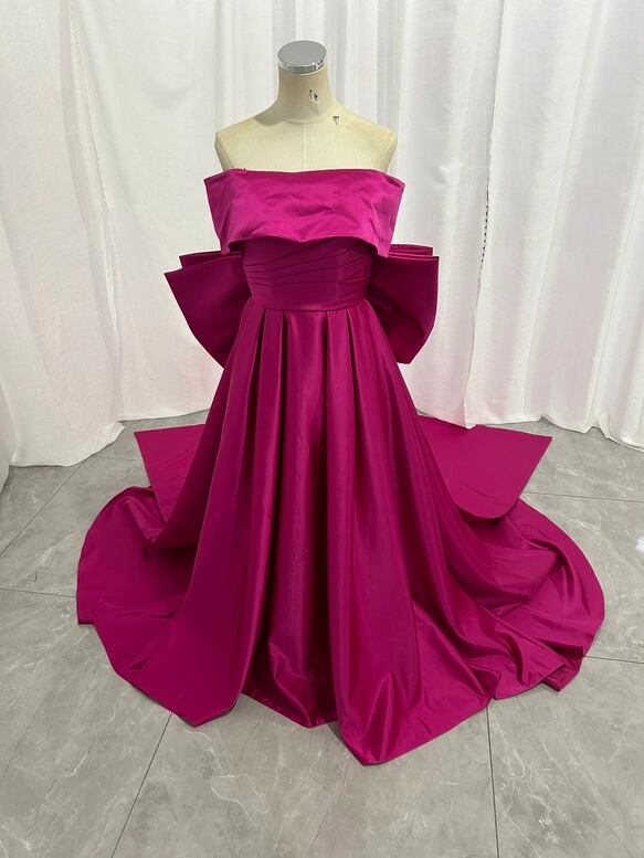 カラードレス ビビッドピンク オフショルダー 豪華なバックリボン 光沢サテン 披露宴