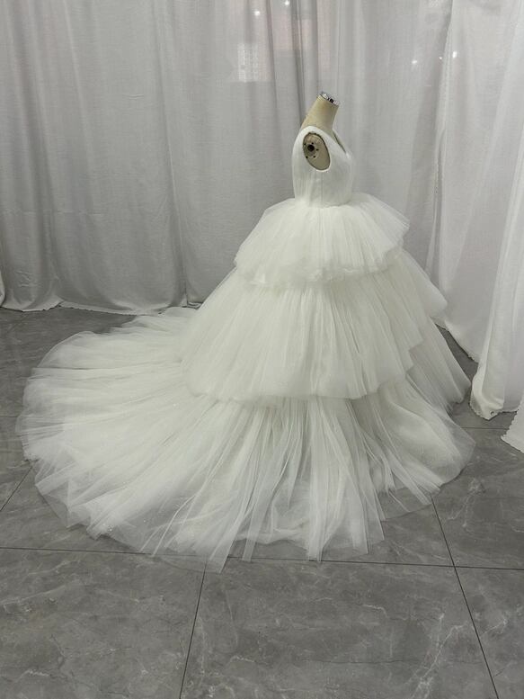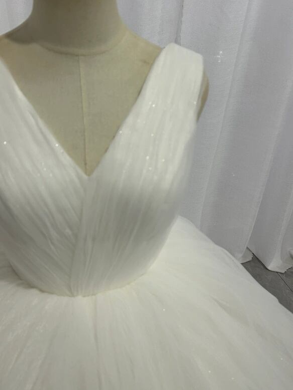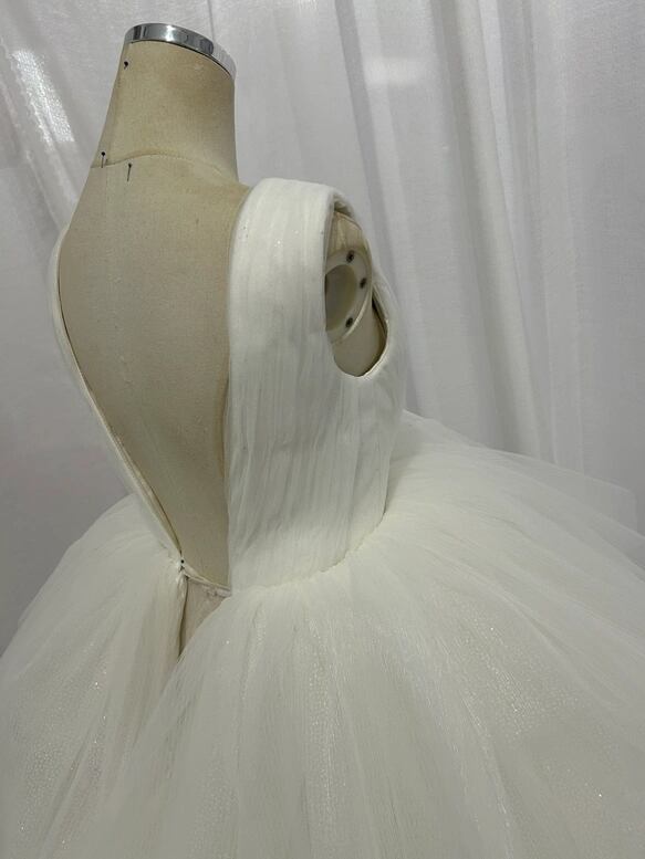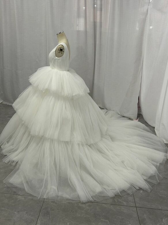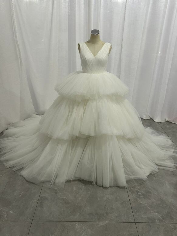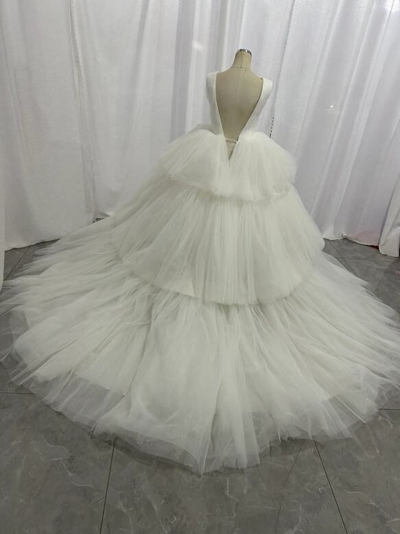 ウエディングドレス ノースリーブ Vネックドレス 背中見せ ティアードのドレス キラキラチュール 結婚式